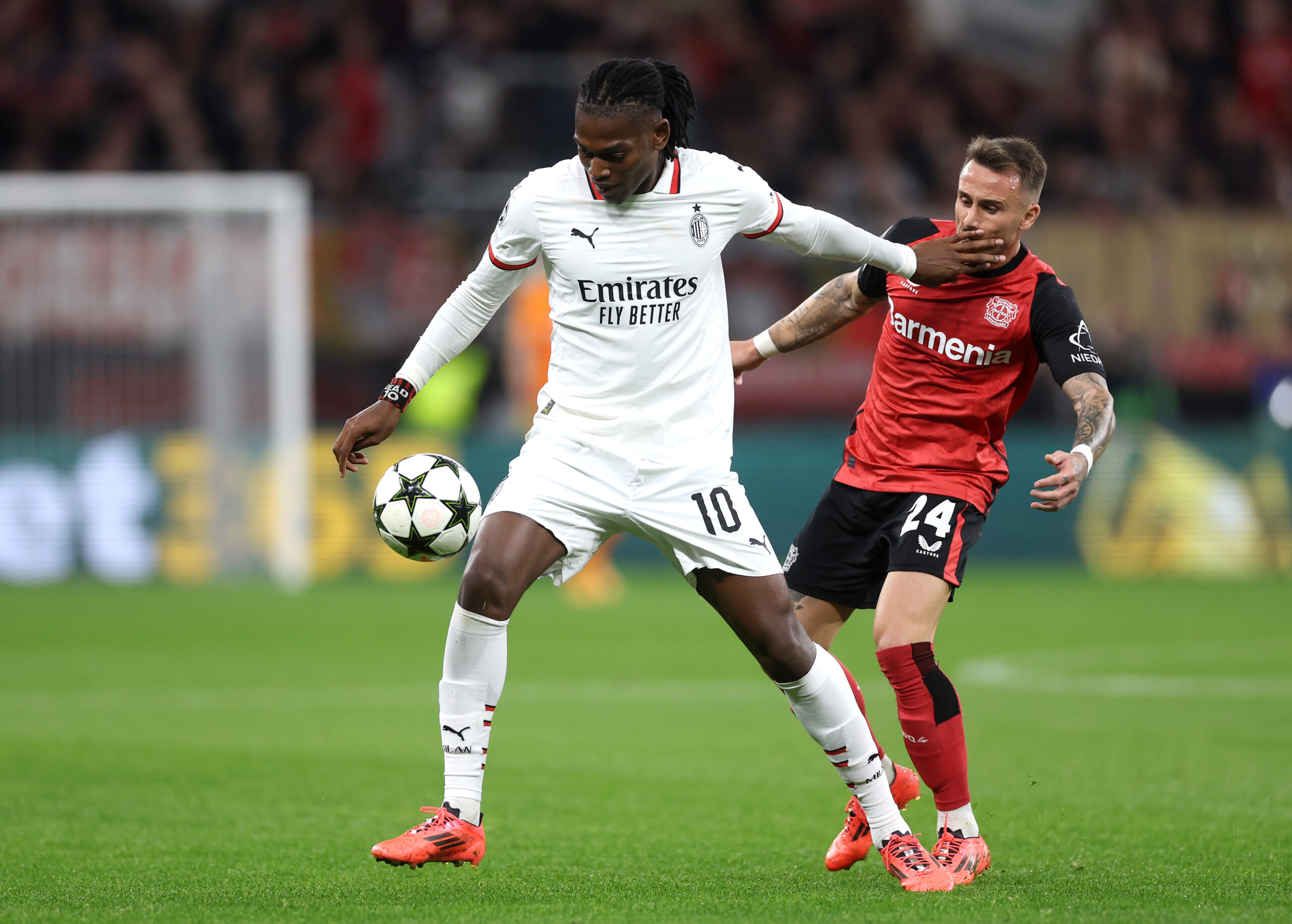 LEVERKUSEN, GERMANY - OCTOBER 01: Rafael Leao of AC Milan is challenged by Aleix Garcia of Bayer 04 Leverkusen during the UEFA Champions League 2024/25 League Phase MD2 match between Bayer 04 Leverkusen and AC Milan at BayArena on October 01, 2024 in Leverkusen, Germany. (Photo by Lars Baron/Getty Images)