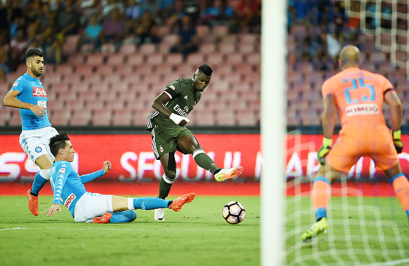 NAPLES, ITALY - AUGUST 27: AC Milan's player M'Baye Niang scores the goal of 2-1 during the Serie A match between SSC Napoli and AC Milan at Stadio San Paolo on August 27, 2016 in Naples, Italy. (Photo by Francesco Pecoraro/Getty Images)