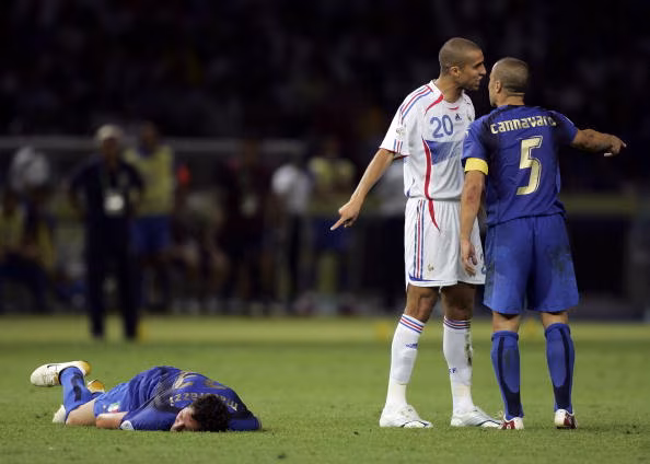 BERLIN - JULY 09: Marco Materazzi (L) of Italy lies injured on the pitch, after being headbutted in the chest by Zinedine Zidane of France during the FIFA World Cup Germany 2006 Final match between Italy and France at the Olympic Stadium on July 9, 2006 in Berlin, Germany. (Photo by Ben Radford/Getty Images)