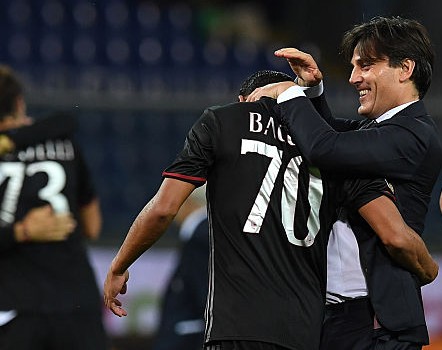 GENOA, ITALY - SEPTEMBER 16: AC Milan head coach Vincenzo Montella (R) celebrates victory with Carlos Bacca at the end of the Serie A match between UC Sampdoria and AC Milan at Stadio Luigi Ferraris on September 16, 2016 in Genoa, Italy. (Photo by Valerio Pennicino/Getty Images)