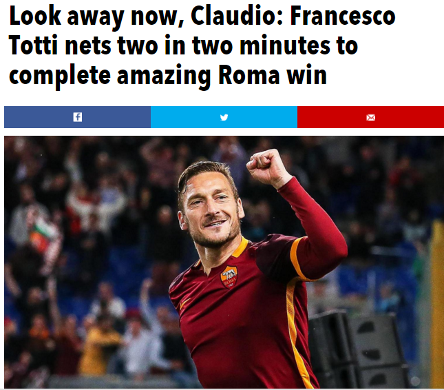 MILANO – L’impresa di Francesco Totti rimarrà nella storia. Una doppietta in pochi minuti alla sua età non è da tutti, o meglio è da Totti. Se ci aggiungiamo le polemiche che ormai da tempo ci portiamo dietro ecco che l’impresa diventa eccezionale. Non solo a Roma o in Italia stiamo celebrando questo campione, tutti i principali giornali esteri non hanno risparmiato elogi per il re di Roma.