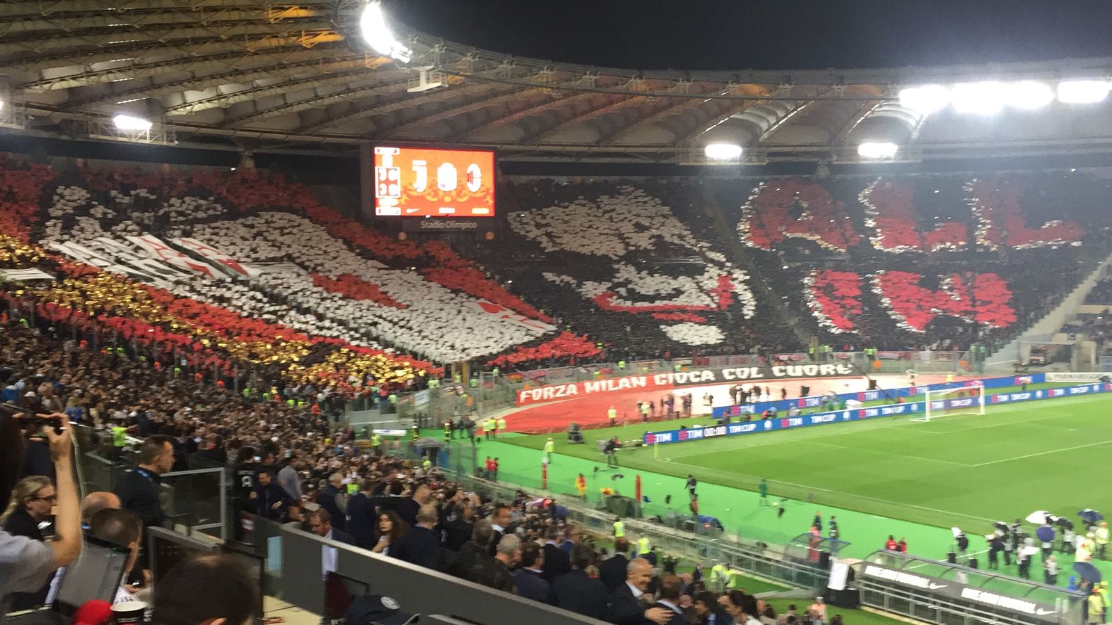 MILANO – Prima della finale di Coppa Italia tra Juventus e Milan i tifosi rossoneri hanno dato spettacolo sugli spalti della Curva Nord. All’ingresso delle due squadre sul terreno di gioco i supporters del Milan hanno “chiamato” l’all-in, cercando di spingere i rossoneri a quella che a tutti gli effetti sarebbe un’impresa. Il settore vicino alla tribuna monte mario ha uno sfondo rosso con un poker d’assi, mentre il lato tribuna tevere è a sfondo nero con il volto di joker e il messaggio diretto alla squadra: “All-in”