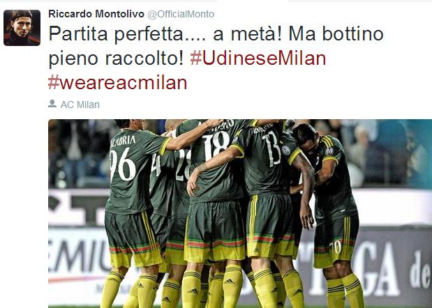 SOCIAL MONTO: “Partita perfetta a metà. Ma bottino pieno raccolto” – così ha commentato attraverso il suo profilo ufficiale di instagram Riccardo Montolivo. Il capitano, ormai vero protagonista di questo Milan, si è ripreso fascia e regia. Ecco il suo commento: