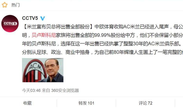 MILANO – Colpo di scena dal Catai! Berlusconi ha venduto il Milan. Con un post su Weibo, uno dei principali social newtwork cinesi, CCTV5, la televisione di Stato cinese ha comunicato la cessione del 99,93% delle azioni del club rossonero da parte del politico e imprenditore italiano al gruppo cinese SES (il restante è dei piccoli azionisti). Berlusconi non resterà in possesso di nessuna quota e uscirà completamente dal Milan, rinunciando quindi forse anche al ruolo di presidente onorario. Intanto, come riporta Milanews, Sino Europe ha invitato ufficialmente i giornalisti cinesi a una conferenza stampa che si terrà nei prossimi giorni a Pechino.