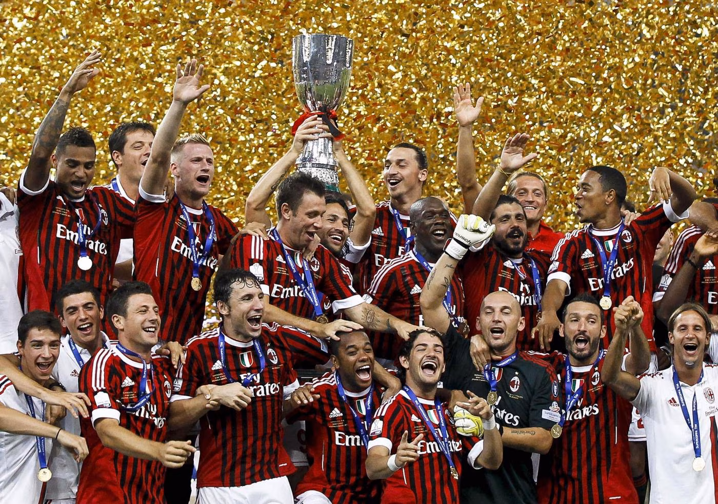 AC Milan's players holds the Italian Super Cup trophy celebrates after winning the game against their city rival Inter Milan at China's National Stadium, also known as the "Bird's Nest", in Beijing, China, Saturday, Aug. 6, 2011. AC Milan won 2-1. (AP Photo/Andy Wong)