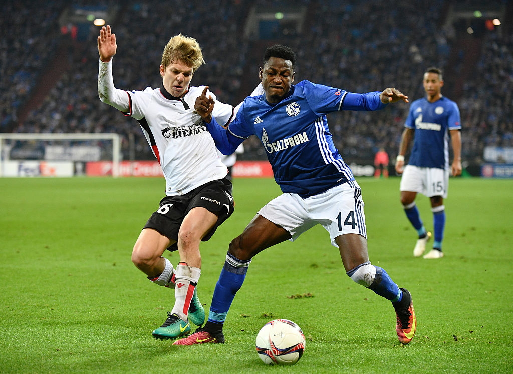 GELSENKIRCHEN, GERMANY - NOVEMBER 24: Baba Rahman of Schalke holds off Vincent Koziello of Nice during the UEFA Europa League Group I match between FC Schalke 04 and OGC Nice at Veltins-Arena on November 24, 2016 in Gelsenkirchen, Germany. (Photo by Stuart Franklin/Bongarts/Getty Images)