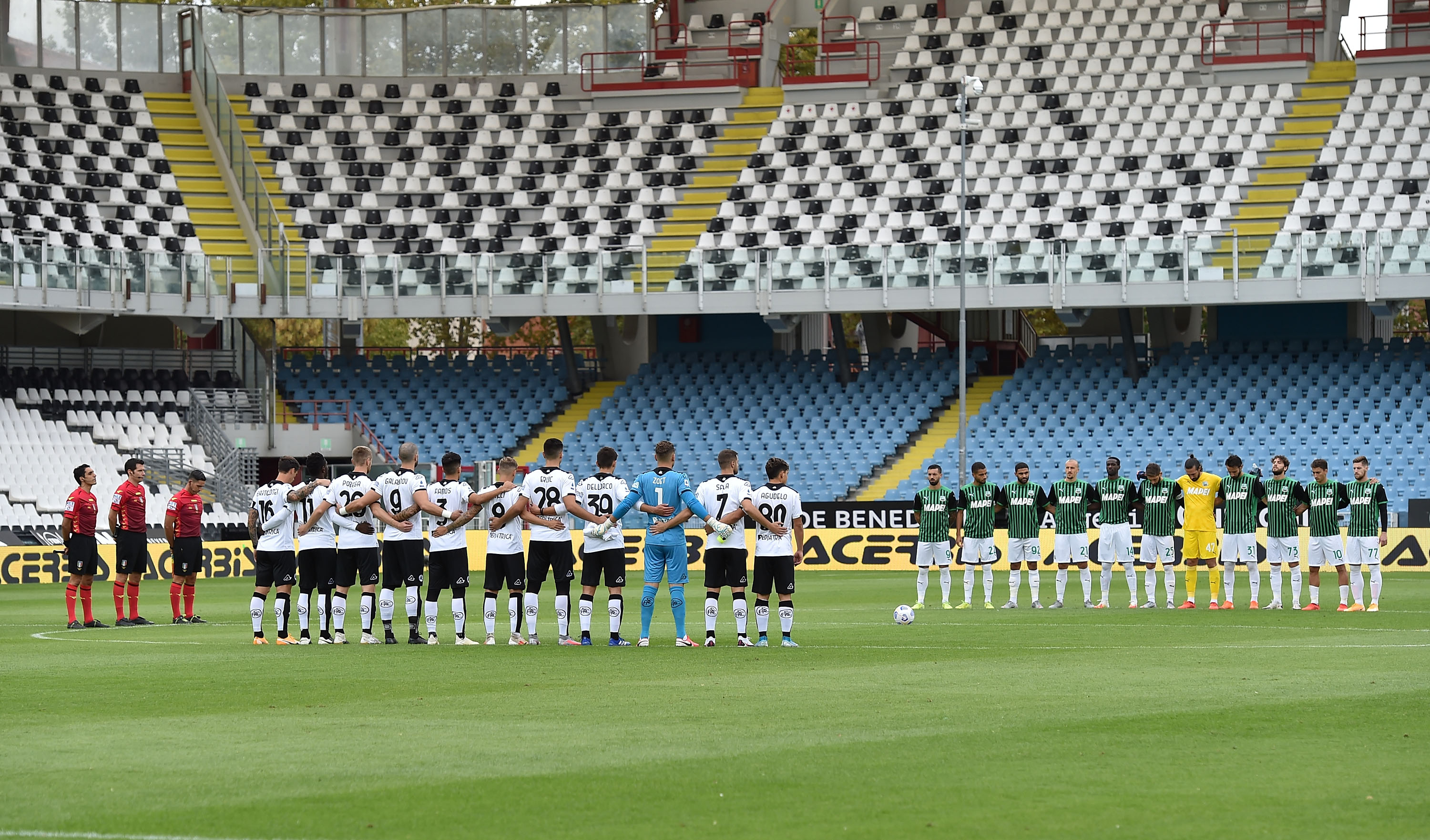 CESENA, ITALY - SEPTEMBER 27: Players of Spezia Calcio and players US Sassuolo line up for a minutes silence prior the Serie A match between Spezia Calcio and US Sassuolo at Dino Manuzzi Stadium on September 27, 2020 in Cesena, Italy. (Photo by Giuseppe Bellini/Getty Images)
