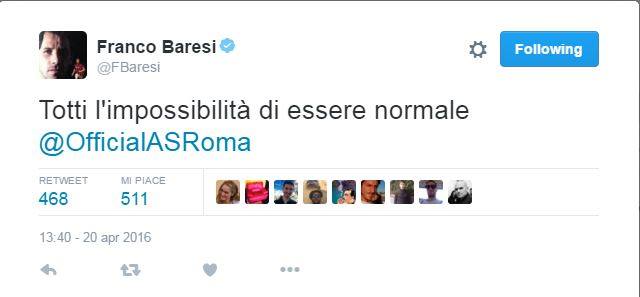 MILANO – Dopo la doppietta di ieri sera di Totti, il mondo del calcio, i media, la stampa gli stanno rendendo il giusto tributo. Anche sui social la reazione di tutti è stata di stupefazione. Tra i personaggi del calcio che hanno voluto dedicare un pensiero al giocatore della Roma, ci sono anche Baresi e Balotelli. Ecco i loro Tweet.