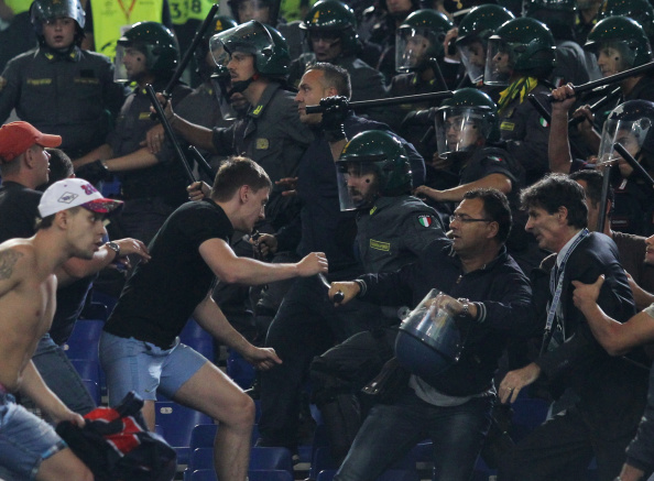 ROME, ITALY - SEPTEMBER 17: PFC CSKA Moskva Fans fight with Police during the UEFA Champions League Group E match between AS Roma and PFC CSKA Moskva on September 17, 2014 in Rome, Italy. (Photo by Paolo Bruno/Getty Images)