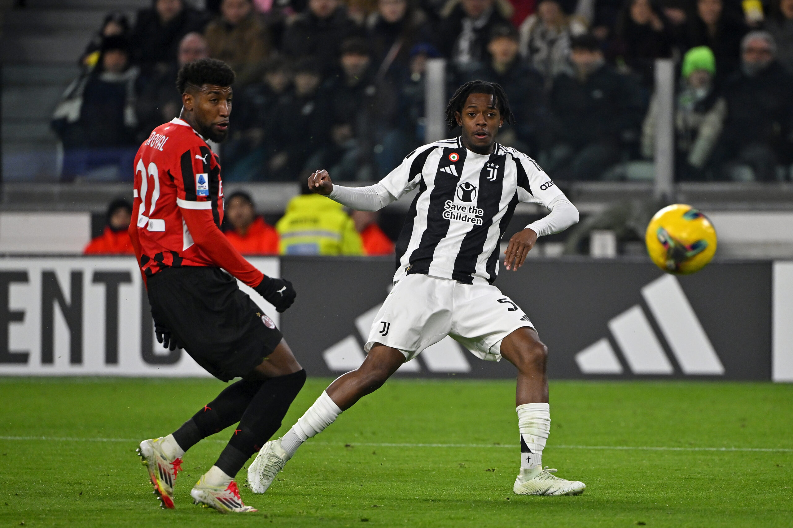 TURIN, ITALY - JANUARY 18: Samuel Mbangula of Juventus scores his team's first goal during the Serie A match between Juventus and AC Milan at Allianz Stadium on January 18, 2025 in Turin, Italy. (Photo by Filippo Alfero - Juventus FC/Juventus FC via Getty Images)