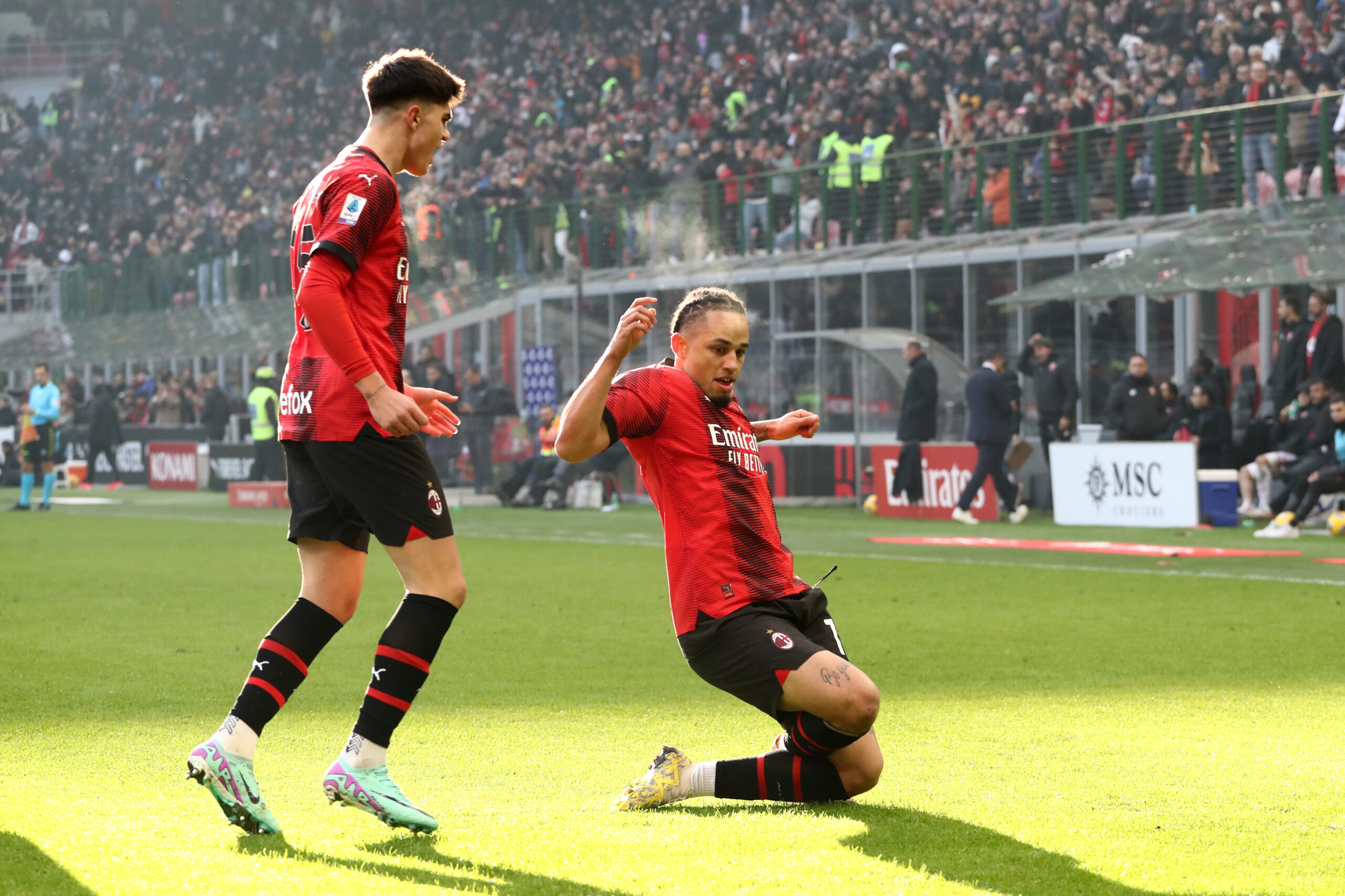 MILAN, ITALY - DECEMBER 17: Noah Okafor of AC Milan celebrates scoring their team's third goal during the Serie A TIM match between AC Milan and AC Monza at Stadio Giuseppe Meazza on December 17, 2023 in Milan, Italy. (Photo by Marco Luzzani/Getty Images)