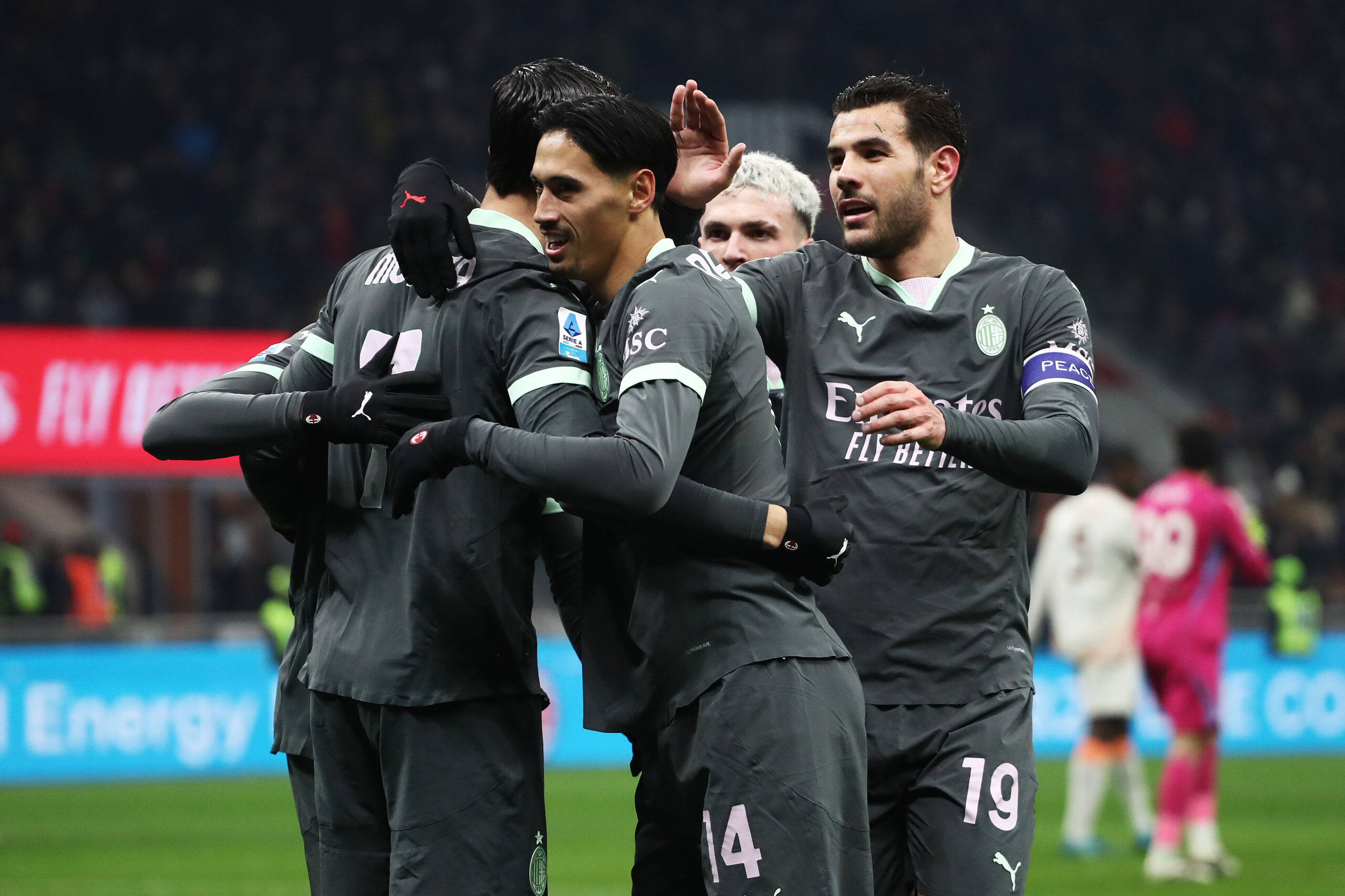 MILAN, ITALY - DECEMBER 29: Tijjani Reijnders of AC Milan celebrates scoring his team's first goal with teammates during the Serie A match between AC Milan and AS Roma at Stadio Giuseppe Meazza on December 29, 2024 in Milan, Italy. (Photo by Marco Luzzani/Getty Images)