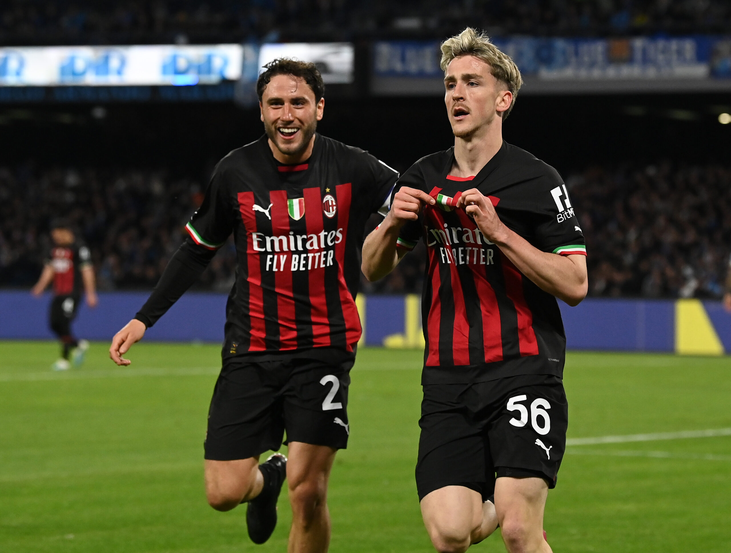 NAPLES, ITALY - APRIL 02: Alexis Saelemaekers of AC Milan celebrates after scoring the goal during the Serie A match between SSC Napoli and AC Milan at Stadio Diego Armando Maradona on April 02, 2023 in Naples, Italy. (Photo by Claudio Villa/AC Milan via Getty Images)