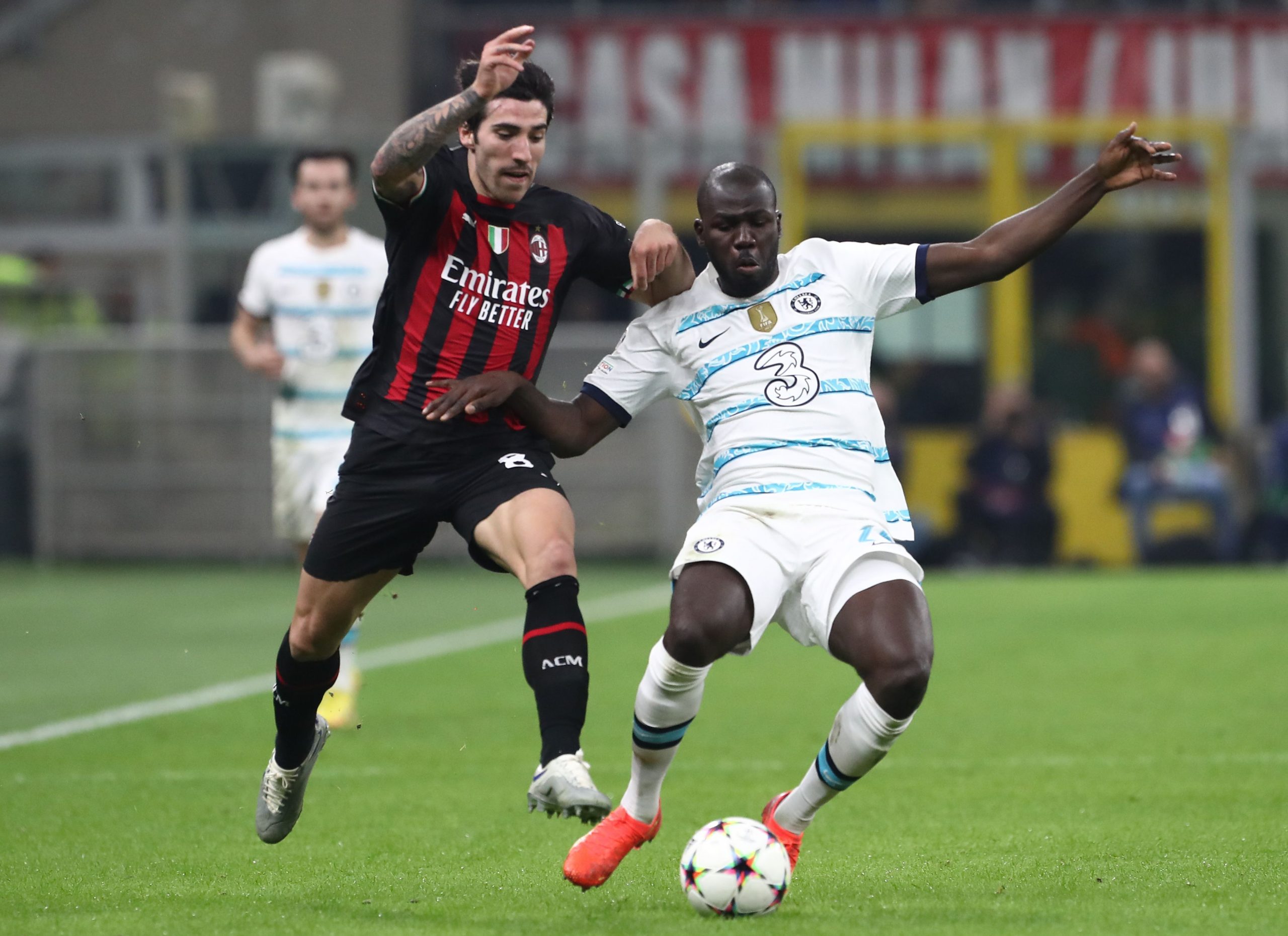 MILAN, ITALY - OCTOBER 11: Kalidou Koulibaly (R) of Chelsea FC competes for the ball with Sandro Tonali (L) and Ismael Bennacer of AC Milan during the UEFA Champions League group E match between AC Milan and Chelsea FC at Giuseppe Meazza Stadium on October 11, 2022 in Milan, Italy. (Photo by Marco Luzzani/Getty Images)
