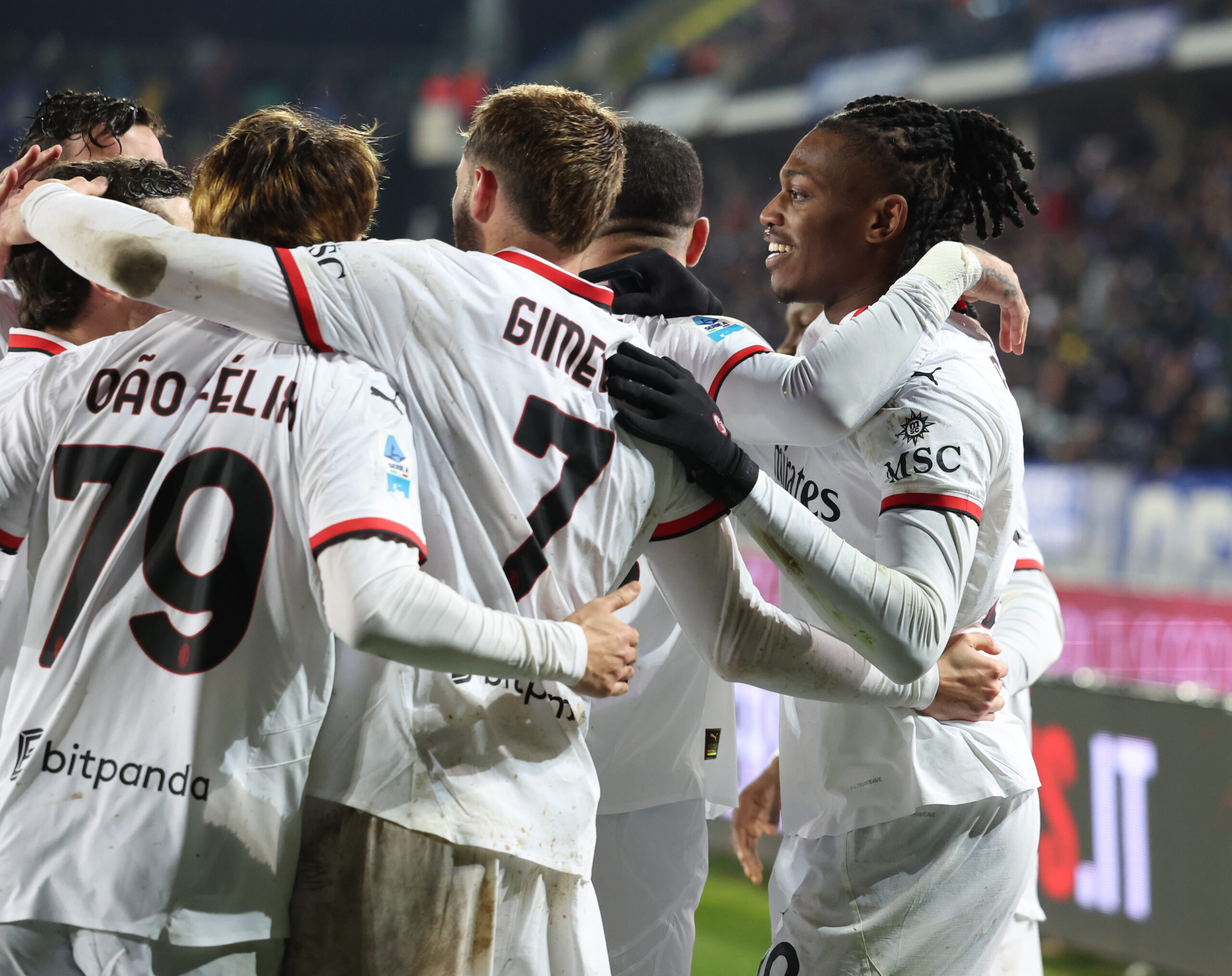 EMPOLI, ITALY - FEBRUARY 08: Rafael Leao of AC Milan celebrates with Joao Felix after scoring the goal during the Serie A match between Empoli and AC Milan at Stadio Carlo Castellani on February 08, 2025 in Empoli, Italy. (Photo by Claudio Villa/AC Milan via Getty Images)
