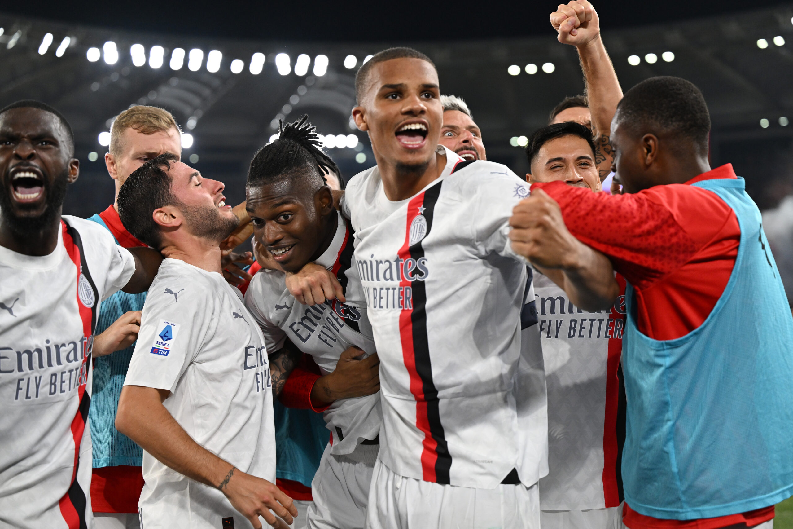 ROME, ITALY - SEPTEMBER 01: Rafael Leao of AC Milan celebrates with team-mates after scoring the goal during the Serie A TIM match between AS Roma and AC Milan at Stadio Olimpico on September 01, 2023 in Rome, Italy. (Photo by Claudio Villa/AC Milan via Getty Images)