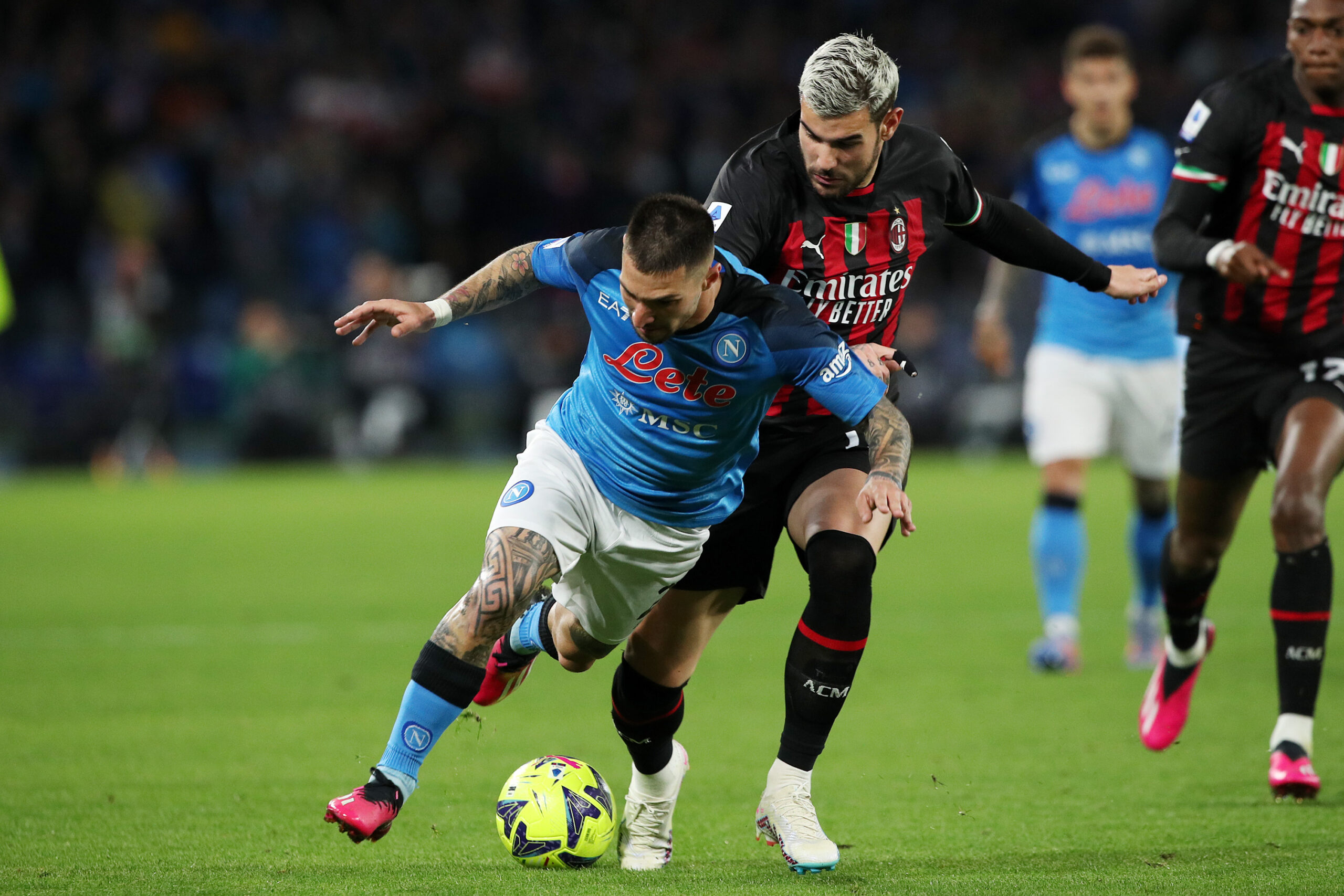 NAPLES, ITALY - APRIL 02: Matteo Politano of SSC Napoli battles for possession with Theo Hernandez of AC Milan during the Serie A match between SSC Napoli and AC Milan at Stadio Diego Armando Maradona on April 02, 2023 in Naples, Italy. (Photo by Francesco Pecoraro/Getty Images)