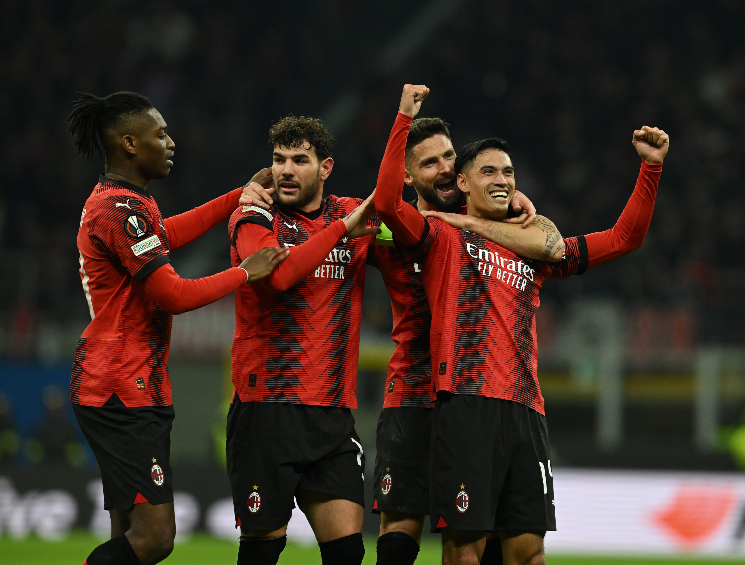 MILAN, ITALY - MARCH 07: Tijjani Reijnder of AC Milan celebrates with team-mates after scoring the goal during the UEFA Europa League 2023/24 round of 16 first leg match between AC Milan and Slavia Praha at Stadio Giuseppe Meazza on March 07, 2024 in Milan, Italy. (Photo by Claudio Villa/AC Milan via Getty Images) (Photo by Claudio Villa/AC Milan via Getty Images)