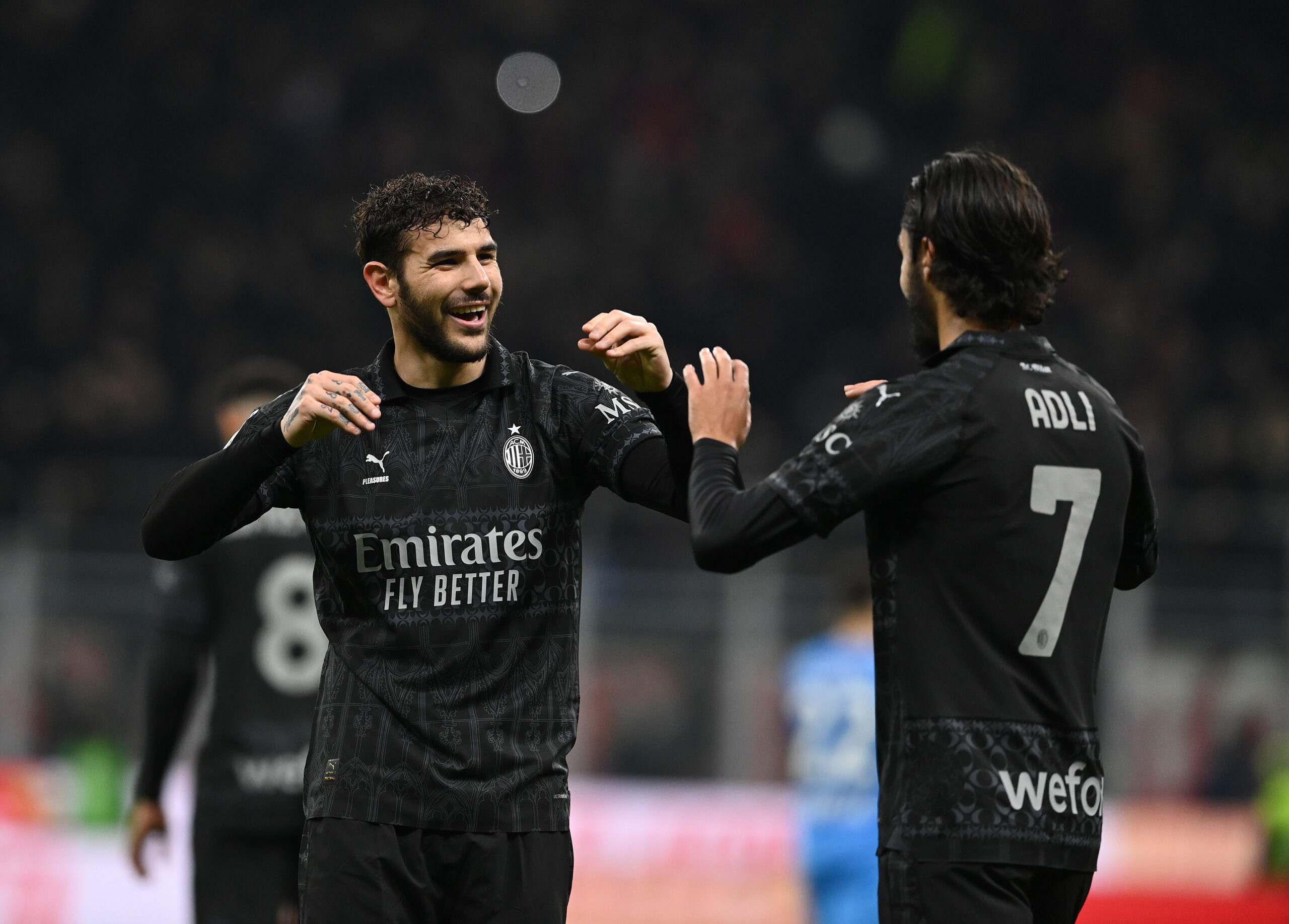 MILAN, ITALY - FEBRUARY 11: Theo Hernandez of AC Milan celebrates with Yacine Adli after scoring the goal during the Serie A TIM match between AC Milan and SSC Napoli - Serie A TIM at Stadio Giuseppe Meazza on February 11, 2024 in Milan, Italy. (Photo by Claudio Villa/AC Milan via Getty Images)
