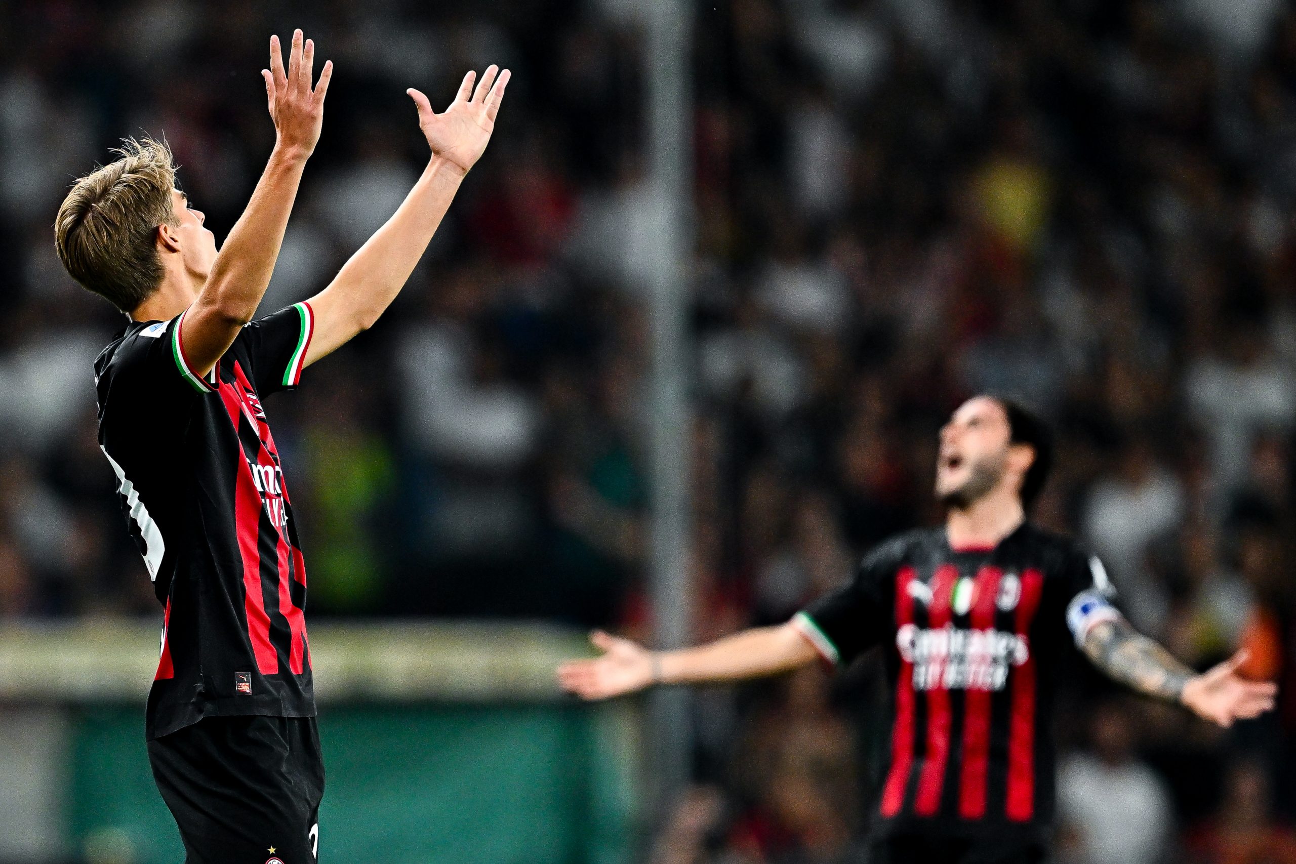 GENOA, ITALY - SEPTEMBER 10: Charles De Ketelaere (L) and Davide Calabria of Milan react with disappointment during the Serie A match between UC Sampdoria and AC MIlan at Stadio Luigi Ferraris on September 10, 2022 in Genoa, Italy. (Photo by Simone Arveda/Getty Images)