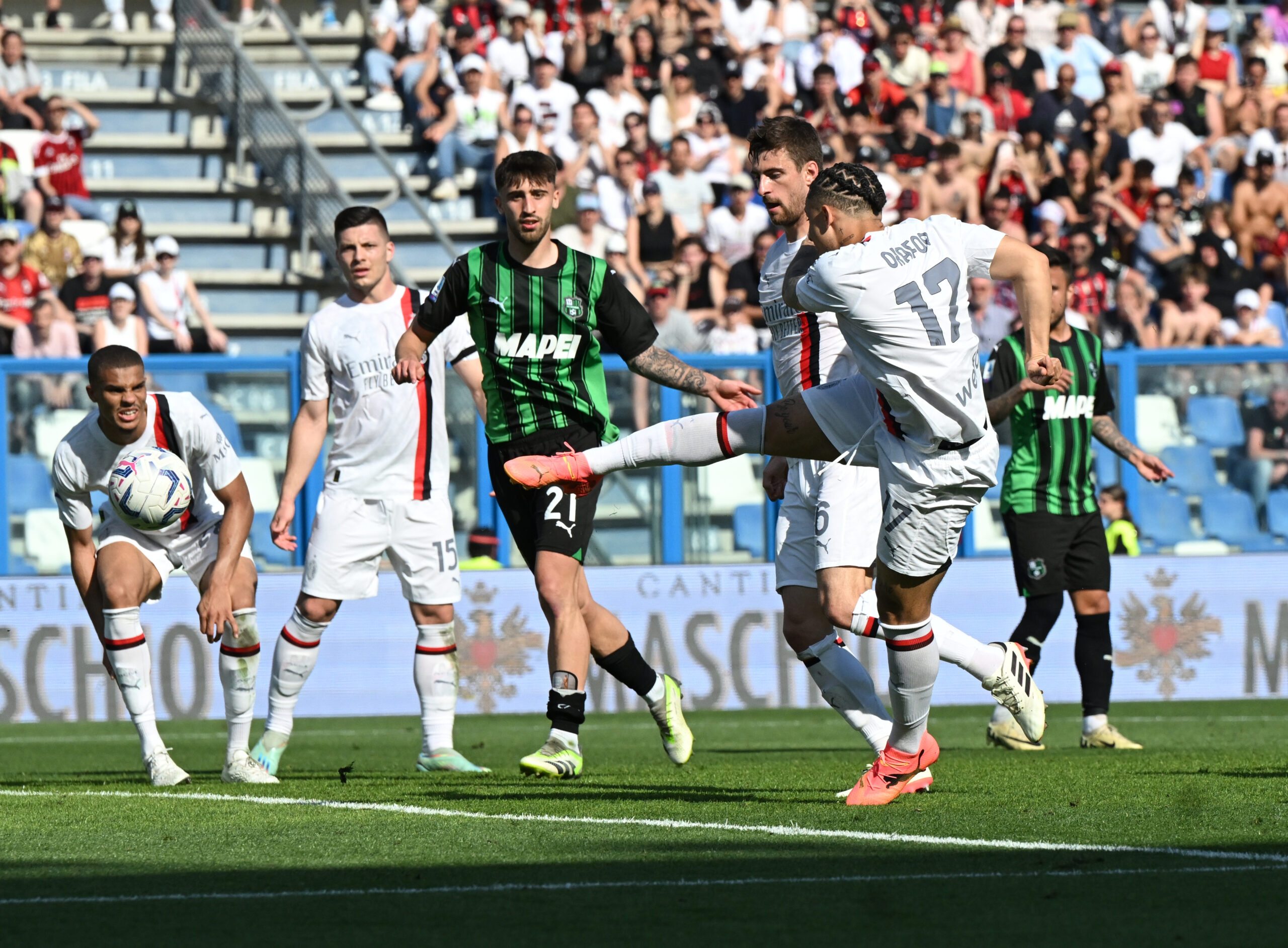 REGGIO NELL'EMILIA, ITALY - APRIL 14: Noah Okafor of AC Milan celebrates scores the goal during the Serie A TIM match between US Sassuolo and AC Milan at Mapei Stadium - Citta' del Tricolore on April 14, 2024 in Reggio nell'Emilia, Italy. (Photo by Claudio Villa/AC Milan via Getty Images)
