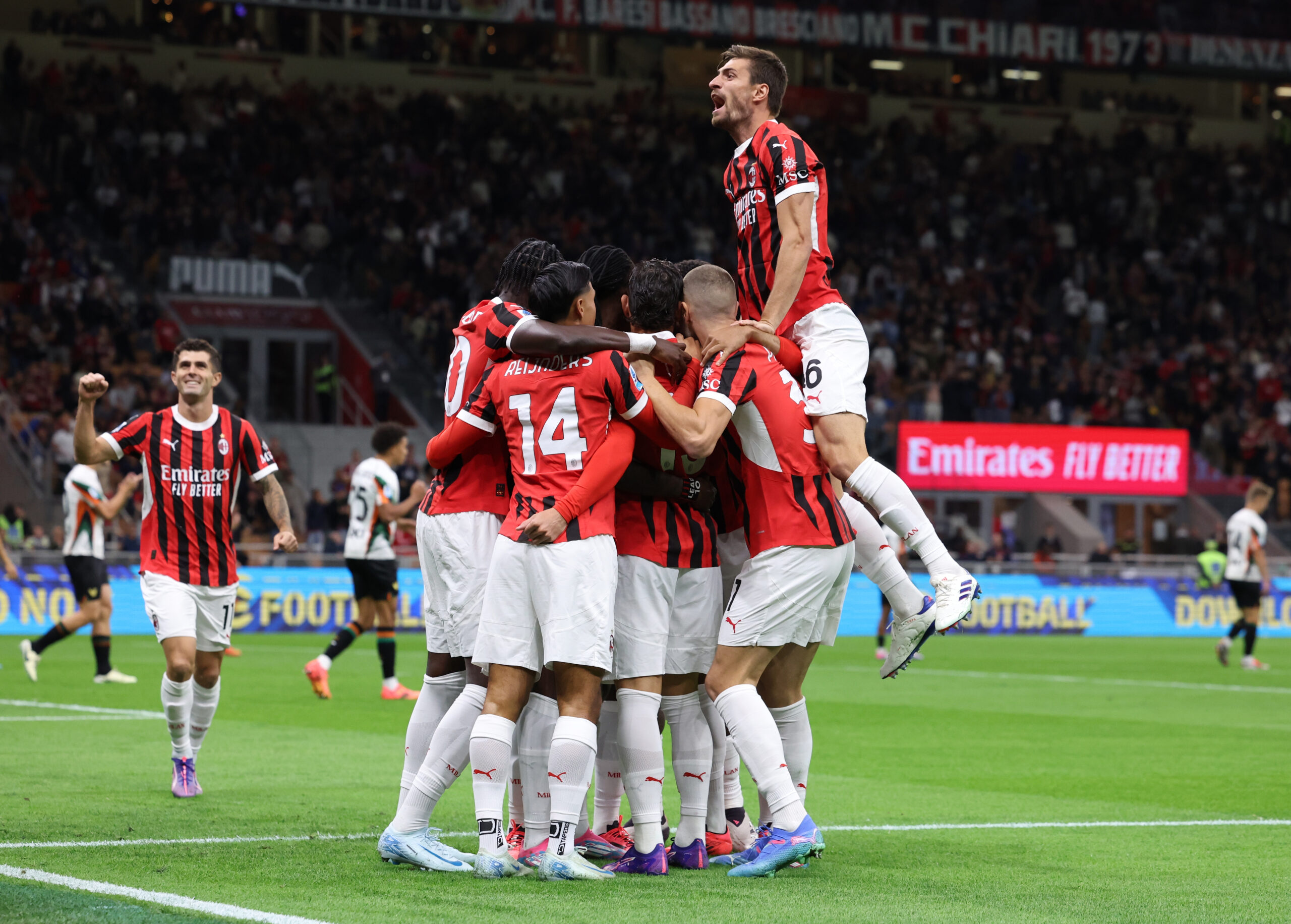 MILAN, ITALY - SEPTEMBER 14: Theo Hernandez of AC Milan celebrates with team-mates after scoring the goal during the Serie A match between Milan and Venezia at Stadio Giuseppe Meazza on September 14, 2024 in Milan, Italy. (Photo by Claudio Villa/AC Milan via Getty Images)
