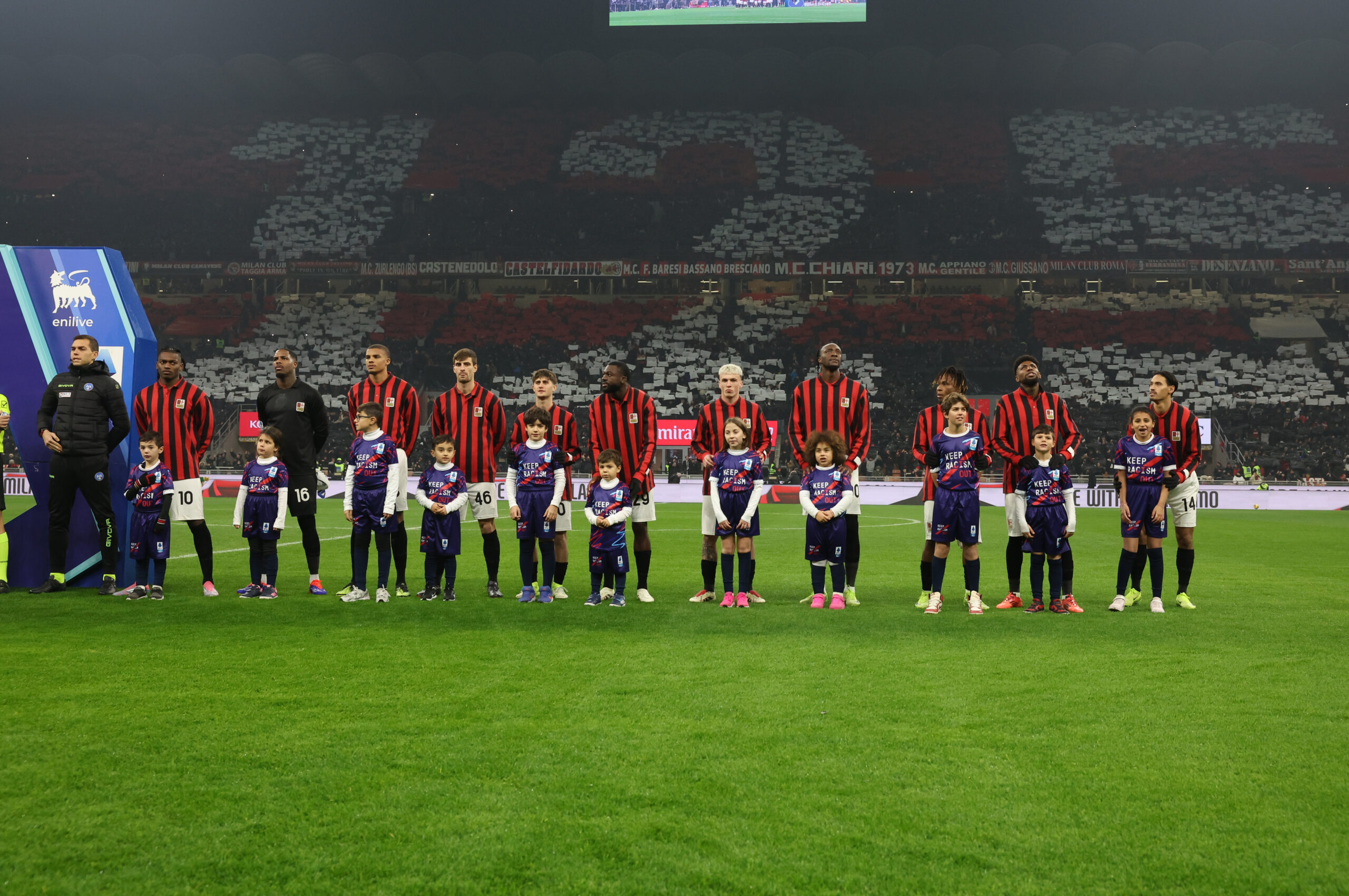 MILAN, ITALY - DECEMBER 15: Players of AC Milan line up prior to the Serie A match between AC Milan and Genoa at Stadio Giuseppe Meazza on December 15, 2024 in Milan, Italy. (Photo by Claudio Villa/AC Milan via Getty Images)