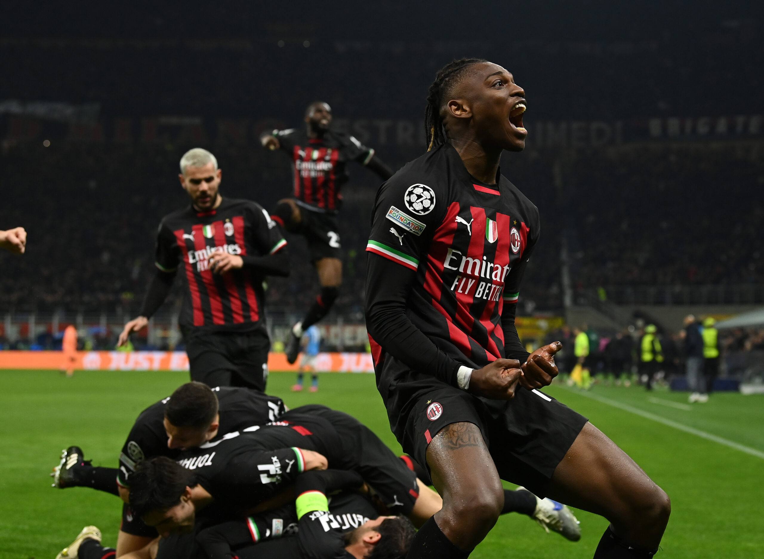 MILAN, ITALY - APRIL 12: Ismael Bennacer of AC Milan celebrates with team-mates after scoring the goal during the UEFA Champions League quarterfinal first leg match between AC Milan and SSC Napoli at Giuseppe Meazza Stadium on April 12, 2023 in Milan, Italy. (Photo by Claudio Villa/AC Milan via Getty Images)