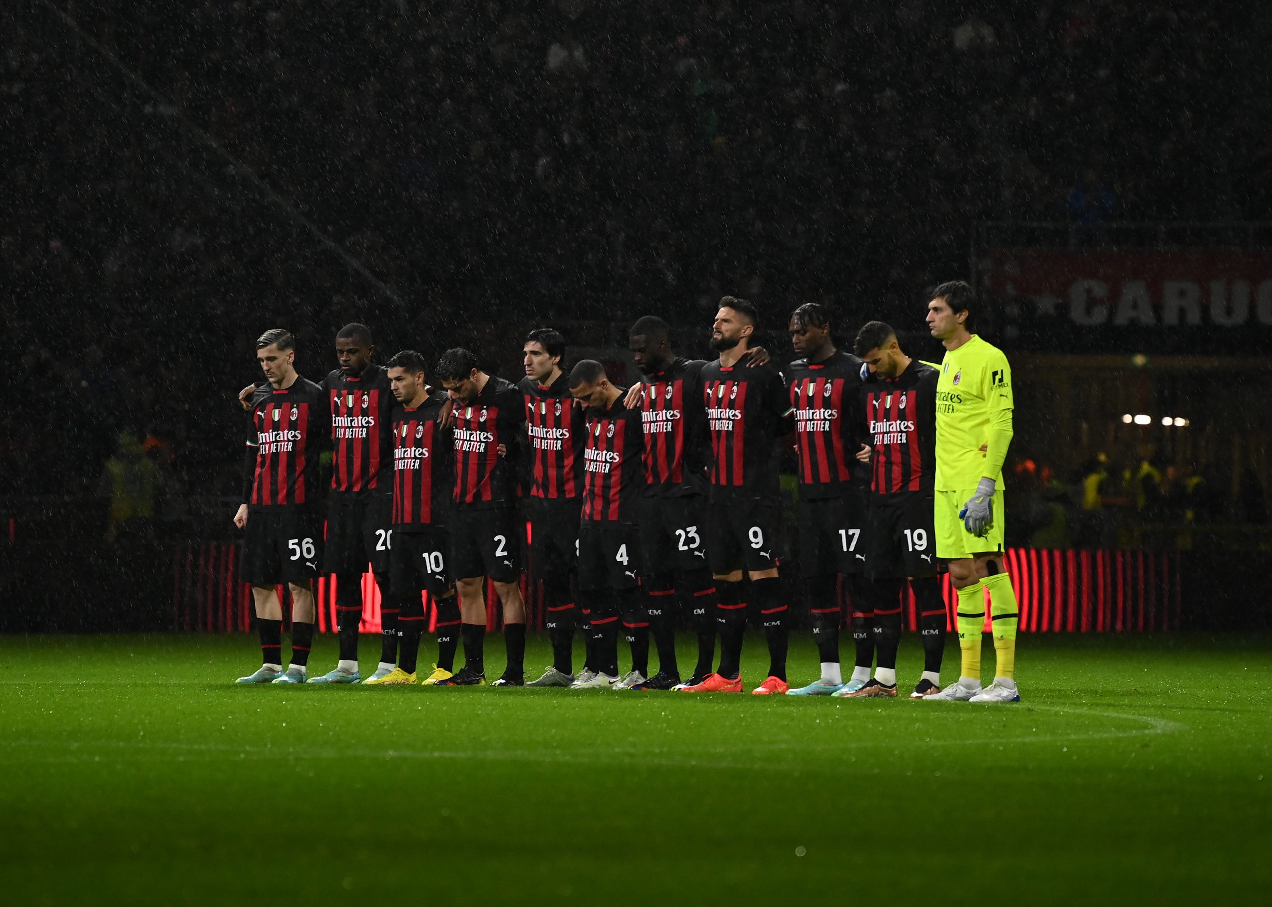 MILAN, ITALY - JANUARY 08: Players of AC Milan observe a minute's silence in memory of Gianluca Vialli and Ernesto Castano prior the Serie A match between AC MIlan and AS Roma at Stadio Giuseppe Meazza on January 08, 2023 in Milan, Italy. (Photo by Claudio Villa/AC Milan via Getty Images)