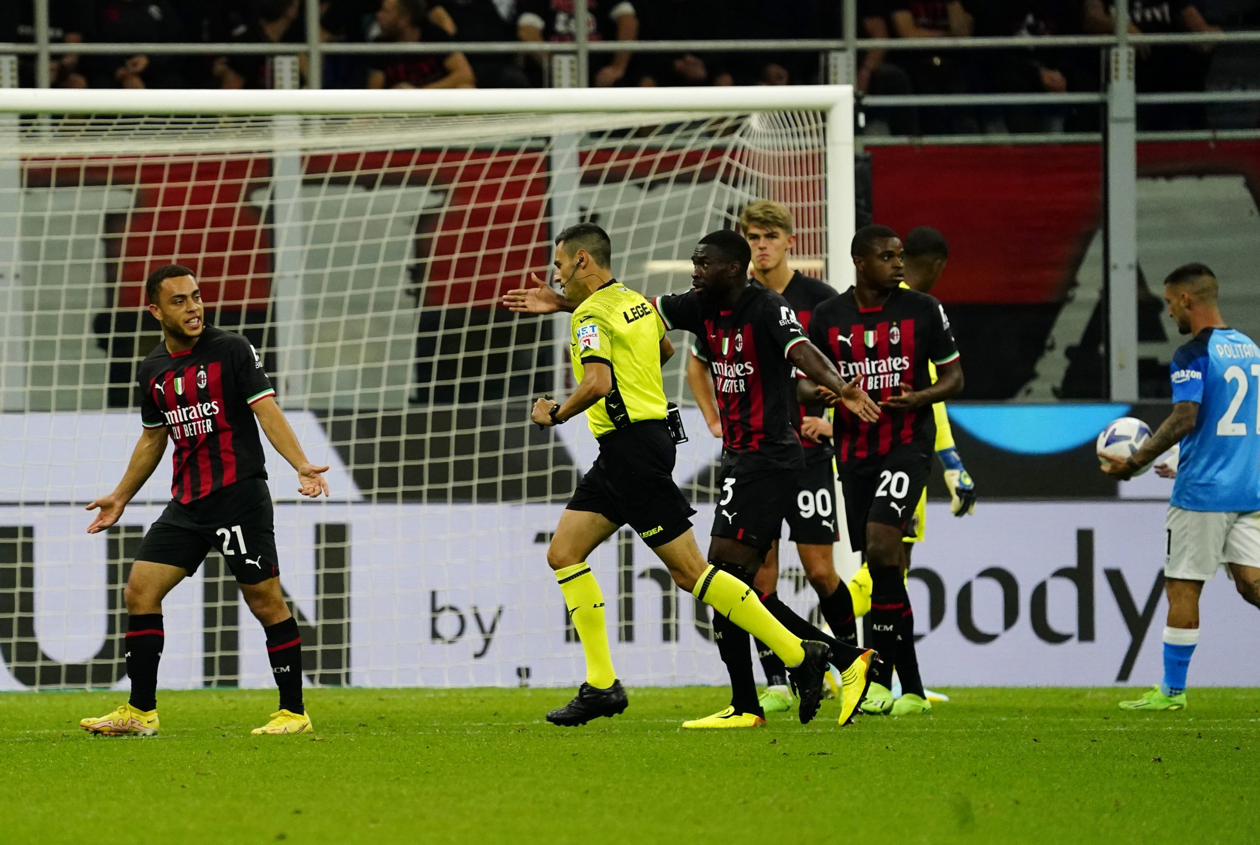 MILAN, ITALY - SEPTEMBER 18: Sergiño Dest of AC Milan reacts with the referee during the Serie A match between AC MIlan and SSC Napoli at Stadio Giuseppe Meazza on September 18, 2022 in Milan, Italy. (Photo by Pier Marco Tacca/AC Milan via Getty Images)