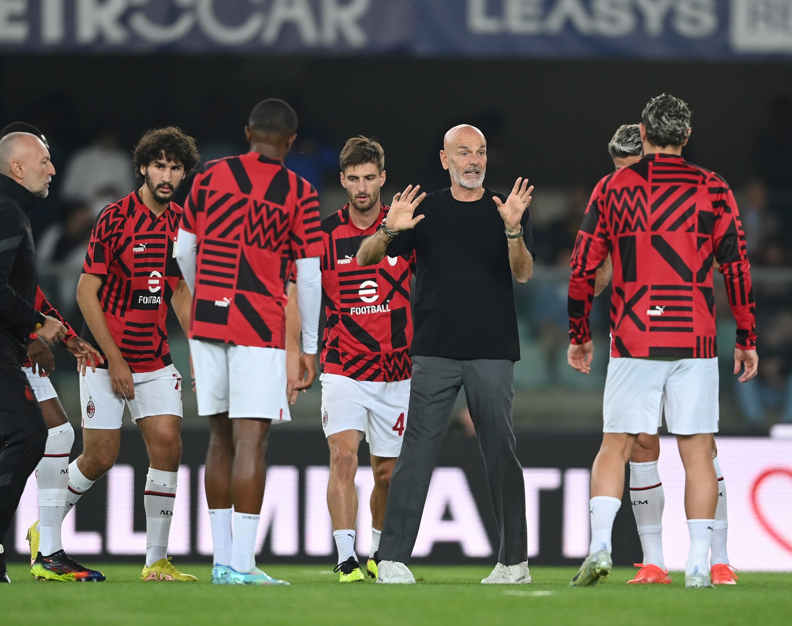 VERONA, ITALY - OCTOBER 16: Head coach of AC Milan Stefano Pioli speak with players before the Serie A match between Hellas Verona and AC MIlan at Stadio Marcantonio Bentegodi on October 16, 2022 in Verona, Italy. (Photo by Claudio Villa/AC Milan via Getty Images)
