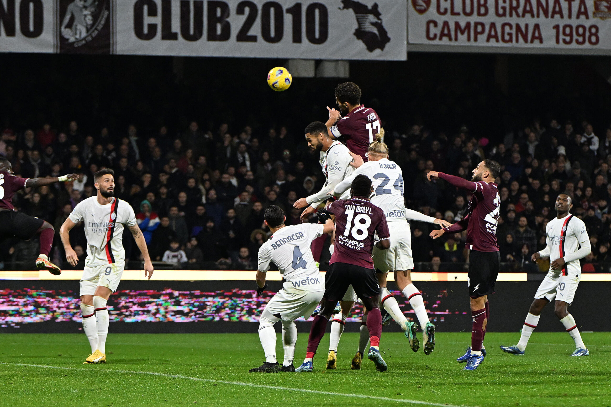 SALERNO, ITALY - DECEMBER 22: Federico Fazio of US Salernitana scores his side first goal during the Serie A TIM match between US Salernitana and AC Milan at Stadio Arechi on December 22, 2023 in Salerno, Italy. (Photo by Francesco Pecoraro/Getty Images)