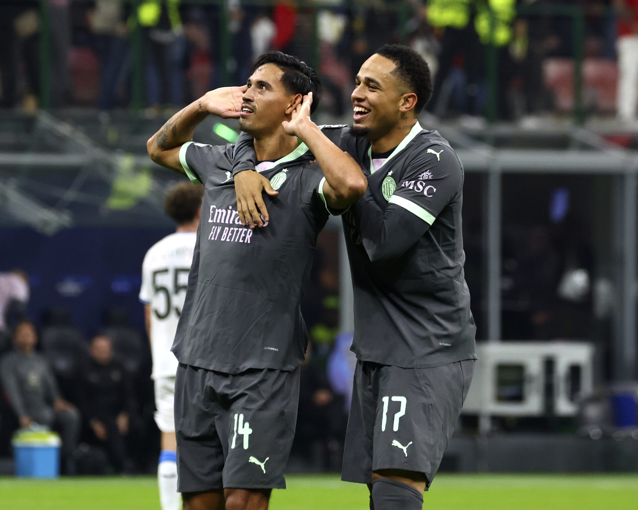 MILAN, ITALY - OCTOBER 22: Tijjani Reijnders of AC Milan celebrates with his teammate Noah Okafor after scoring his team's second goal during the UEFA Champions League 2024/25 League Phase MD3 match between AC Milan and Club Brugge KV at Stadio San Siro on October 22, 2024 in Milan, Italy. (Photo by Giuseppe Cottini/AC Milan via Getty Images)