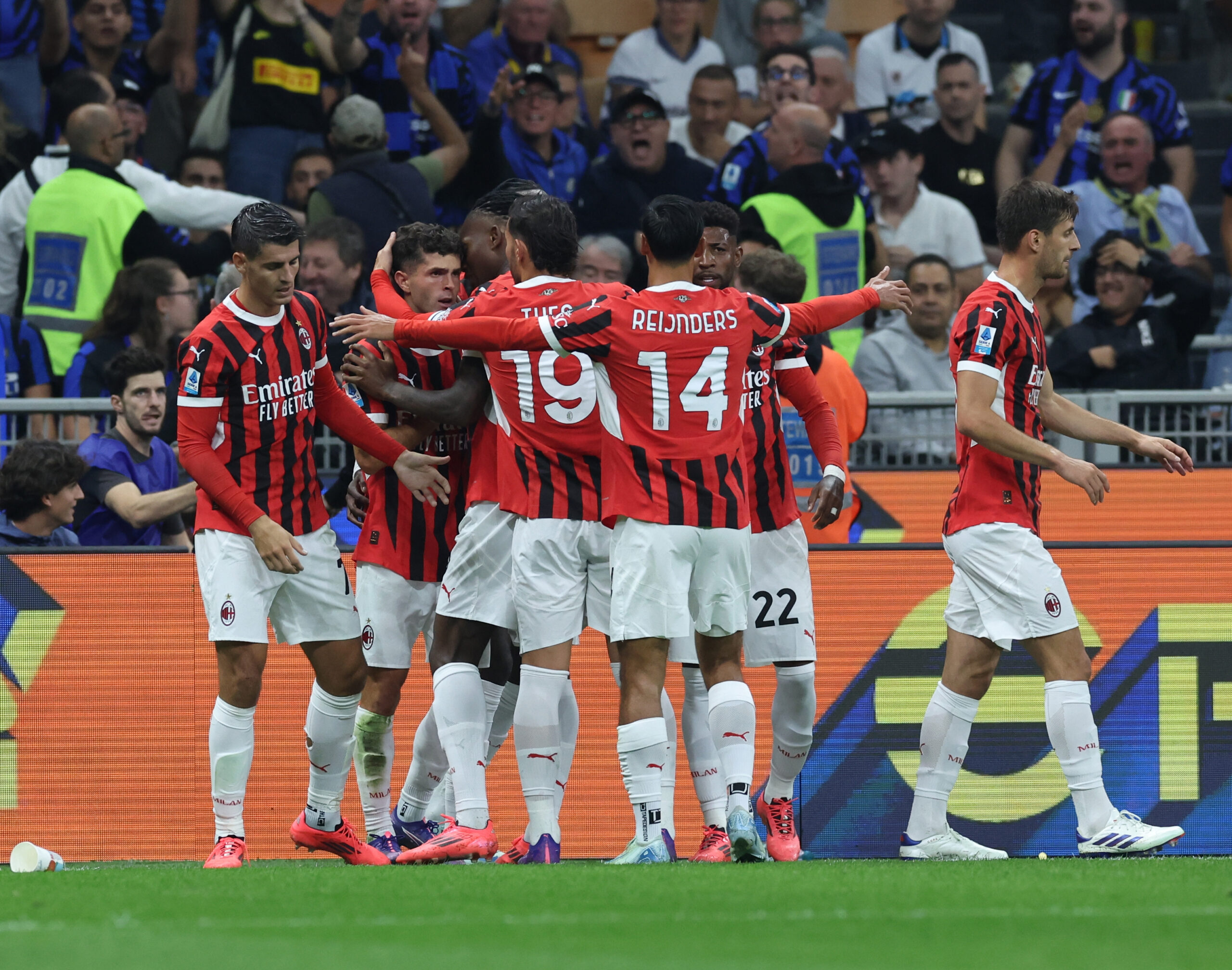 MILAN, ITALY - SEPTEMBER 22: Christian Pulisic of AC Milan celebrates with team-mates after scoring the goal during the Serie A match between Inter and Milan at Stadio Giuseppe Meazza on September 22, 2024 in Milan, Italy. (Photo by Claudio Villa/AC Milan via Getty Images)