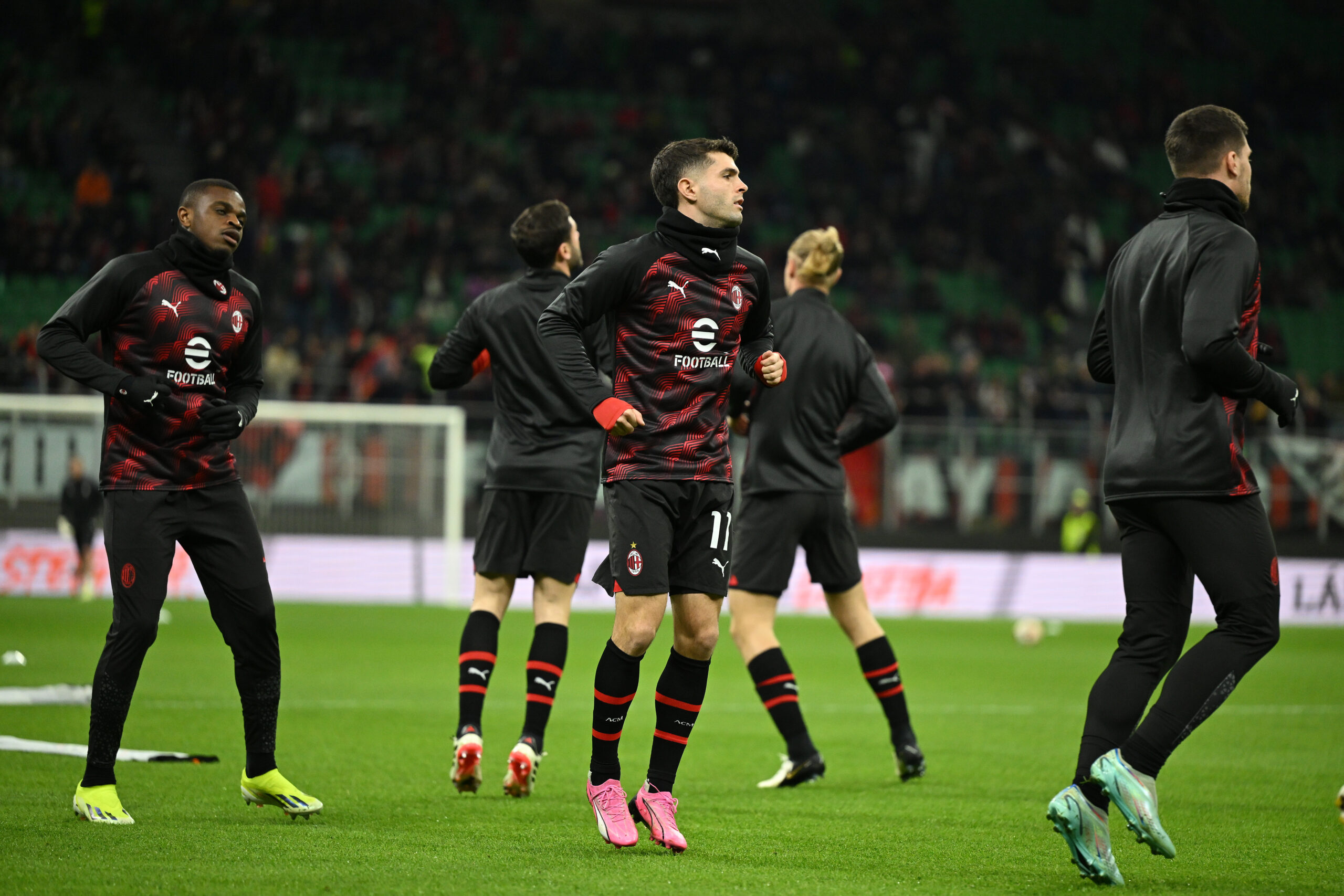 MILAN, ITALY - MARCH 07: Players of AC Milan warm up before the UEFA Europa League 2023/24 round of 16 first leg match between AC Milan and Slavia Praha at Stadio Giuseppe Meazza on March 07, 2024 in Milan, Italy. (Photo by Claudio Villa/AC Milan via Getty Images) (Photo by Claudio Villa/AC Milan via Getty Images)
