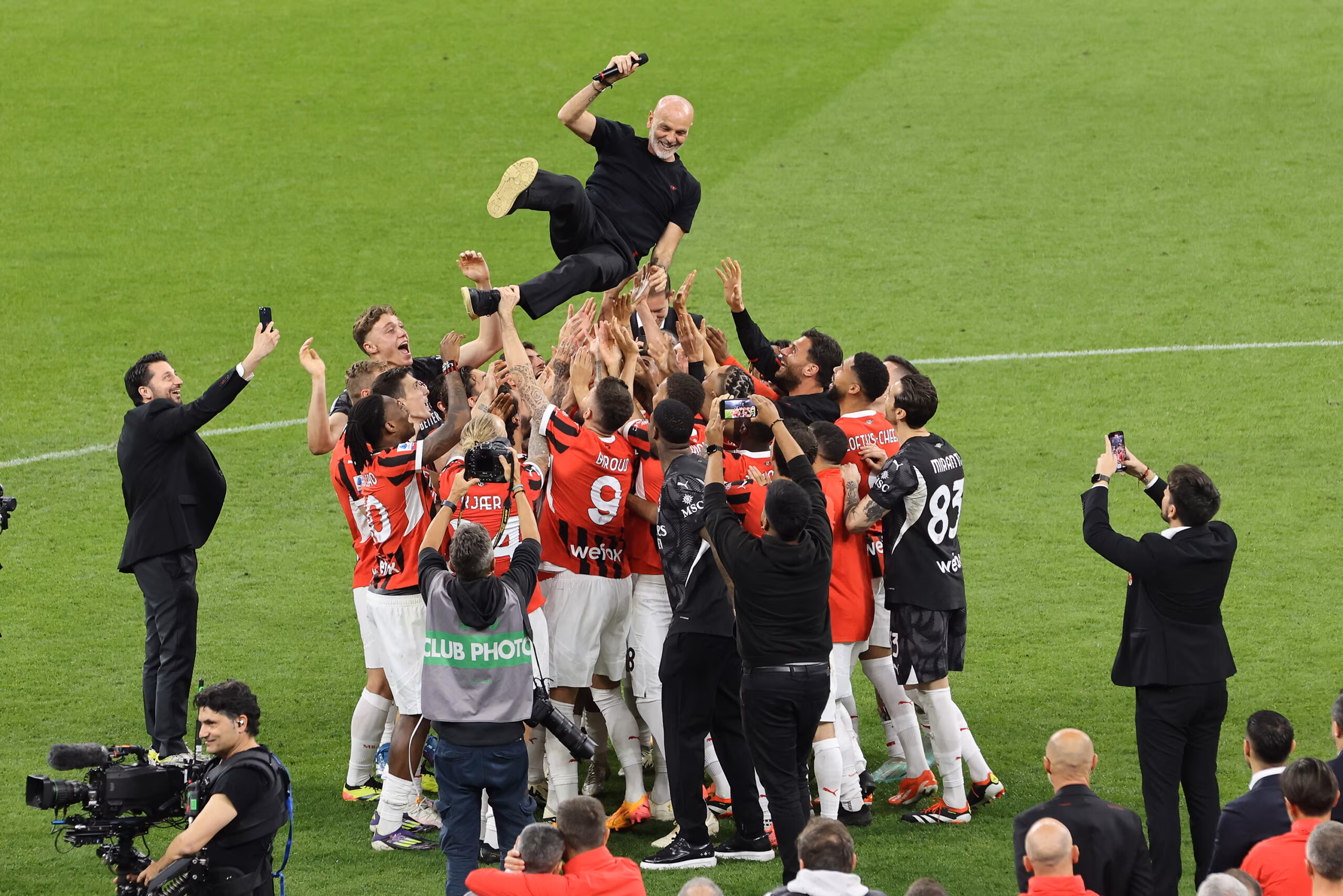 MILAN, ITALY - MAY 25: AC Milan's Italian coach Stefano Pioli is celebrated by AC Milan's players at the end the Serie A TIM match between AC Milan and US Salernitana at Stadio Giuseppe Meazza on May 25, 2024 in Milan, Italy. (Photo by Vincenzo Lombardo/AC Milan via Getty Images)