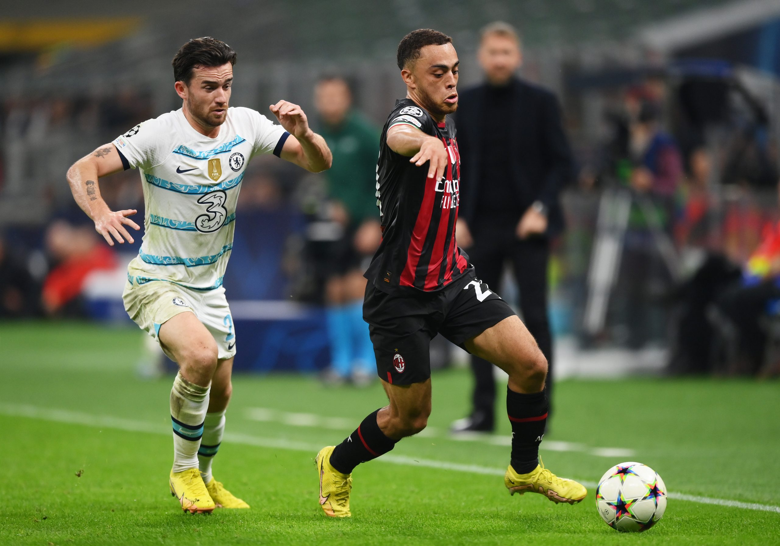 MILAN, ITALY - OCTOBER 11: Sergino Dest of AC Milan is put under pressure by Ben Chilwell of Chelsea during the UEFA Champions League group E match between AC Milan and Chelsea FC at Giuseppe Meazza Stadium on October 11, 2022 in Milan, Italy. (Photo by Shaun Botterill/Getty Images)