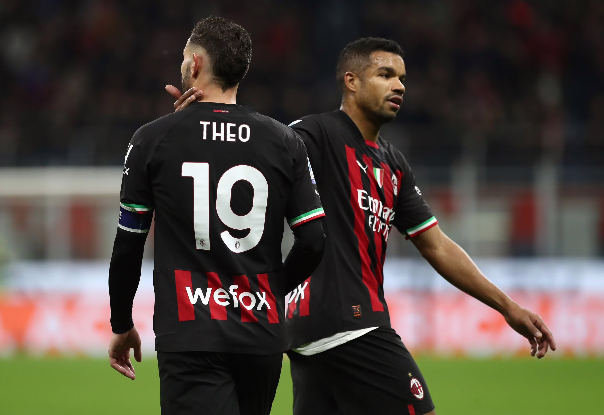 MILAN, ITALY - NOVEMBER 05: Theo Hernandez (R) of AC Milan celebrates with his team-mate Junior Messias (R) after scoring the opening goal during the Serie A match between AC Milan and Spezia Calcio at Stadio Giuseppe Meazza on November 05, 2022 in Milan, Italy. (Photo by Marco Luzzani/Getty Images)