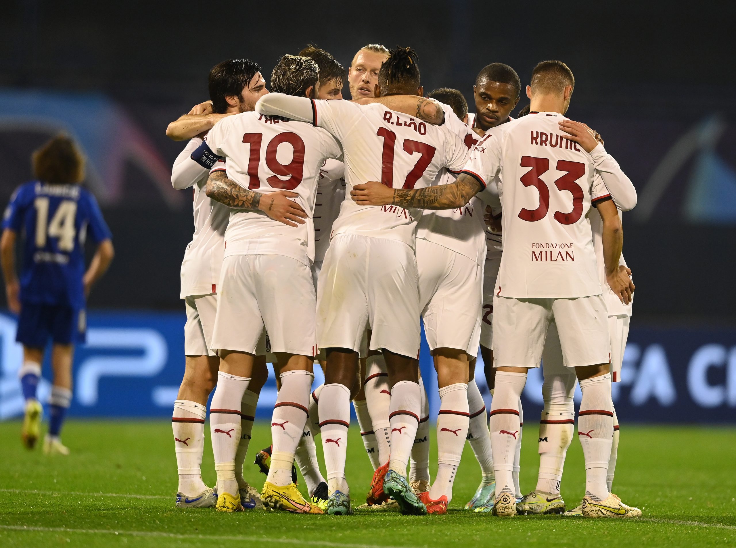 ZAGREB, CROATIA - OCTOBER 25: Olivier Giroud of AC Milan celebrates with team-mates after scoring the goal during the UEFA Champions League group E match between Dinamo Zagreb and AC Milan at Stadion Maksimir on October 25, 2022 in Zagreb, Croatia. (Photo by Claudio Villa/AC Milan via Getty Images)