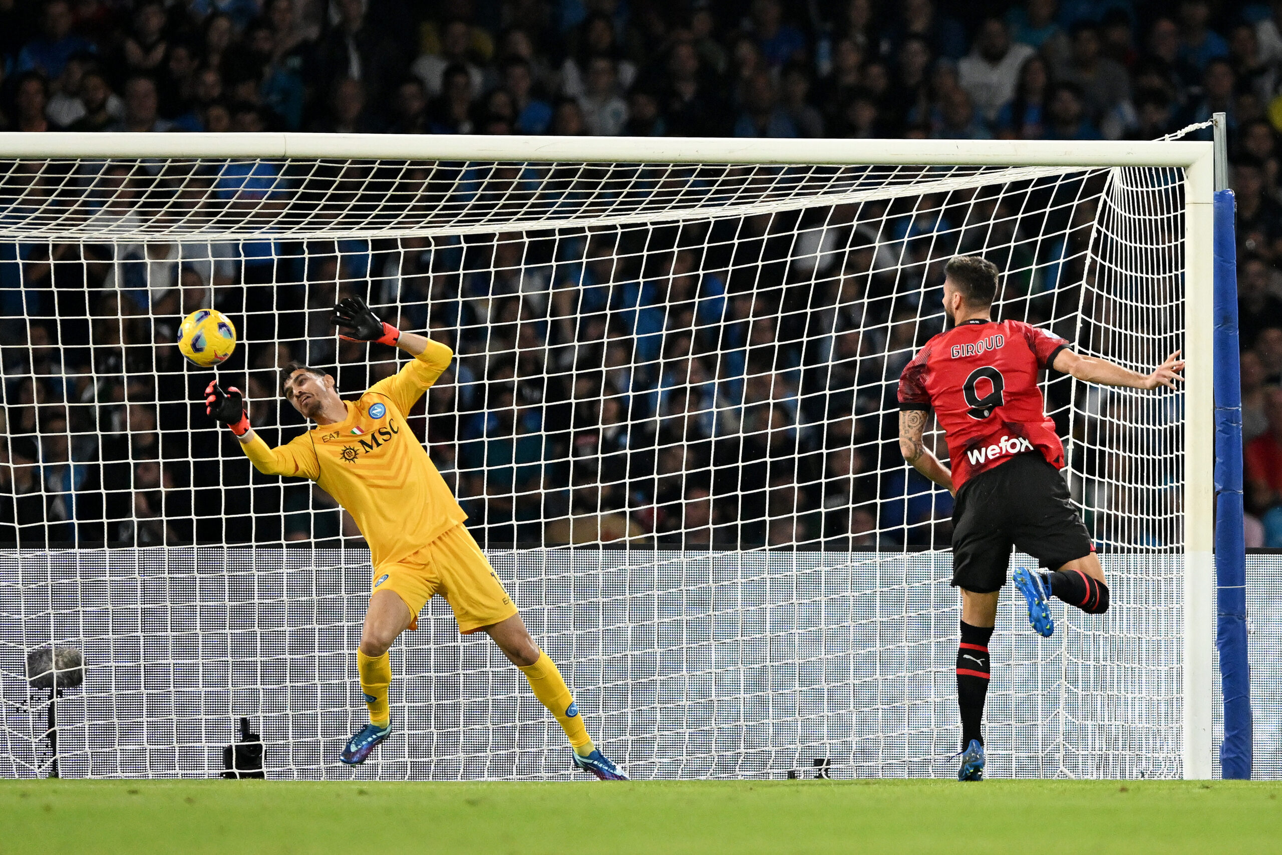 NAPLES, ITALY - OCTOBER 29: Olivier Giroud of AC Milan scores the team's first goal as Alex Meret of SSC Napoli fails to make a save during the Serie A TIM match between SSC Napoli and AC Milan at Stadio Diego Armando Maradona on October 29, 2023 in Naples, Italy. (Photo by Francesco Pecoraro/Getty Images)
