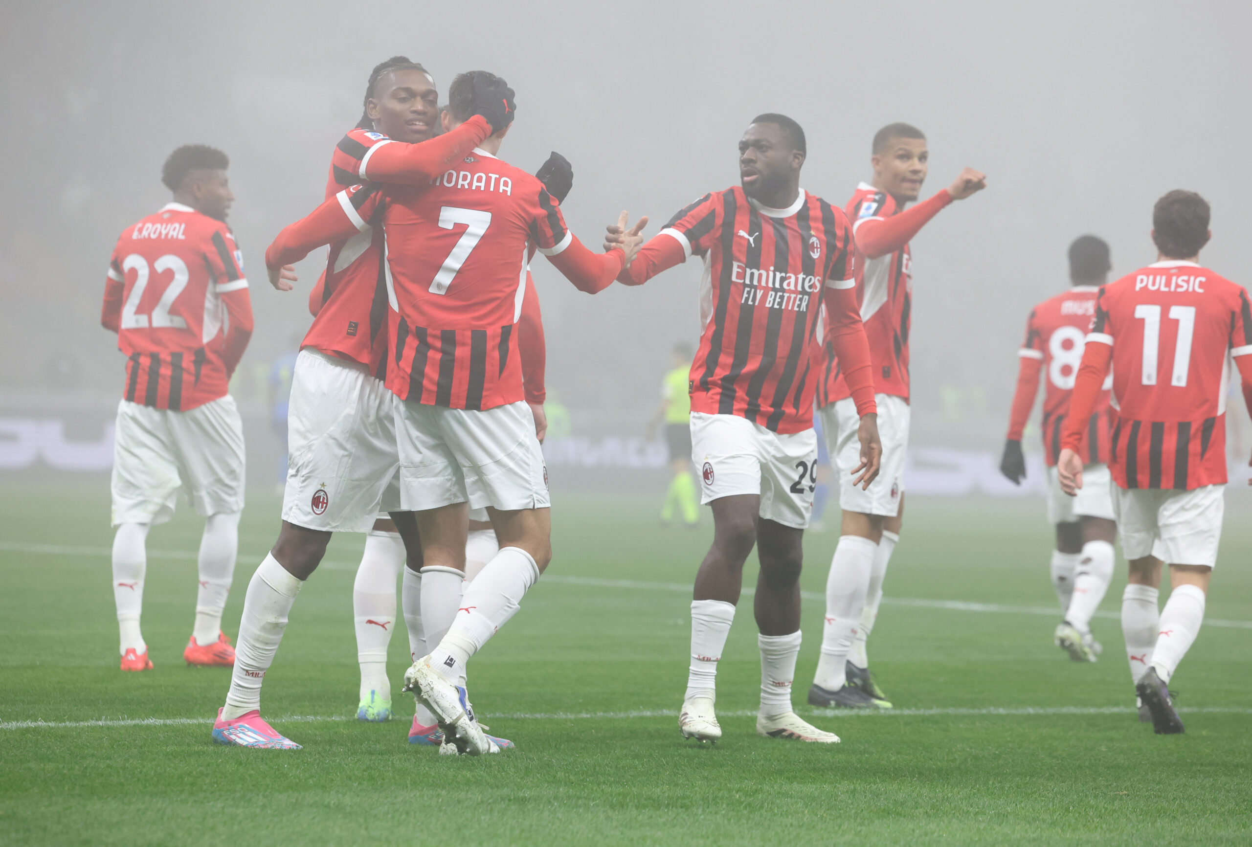 MILAN, ITALY - NOVEMBER 30: Alvaro Morata of AC Milan celebrates with team-mates after scoring the goal during the Serie A match between Milan and Empoli at Stadio Giuseppe Meazza on November 30, 2024 in Milan, Italy. (Photo by Claudio Villa/AC Milan via Getty Images)