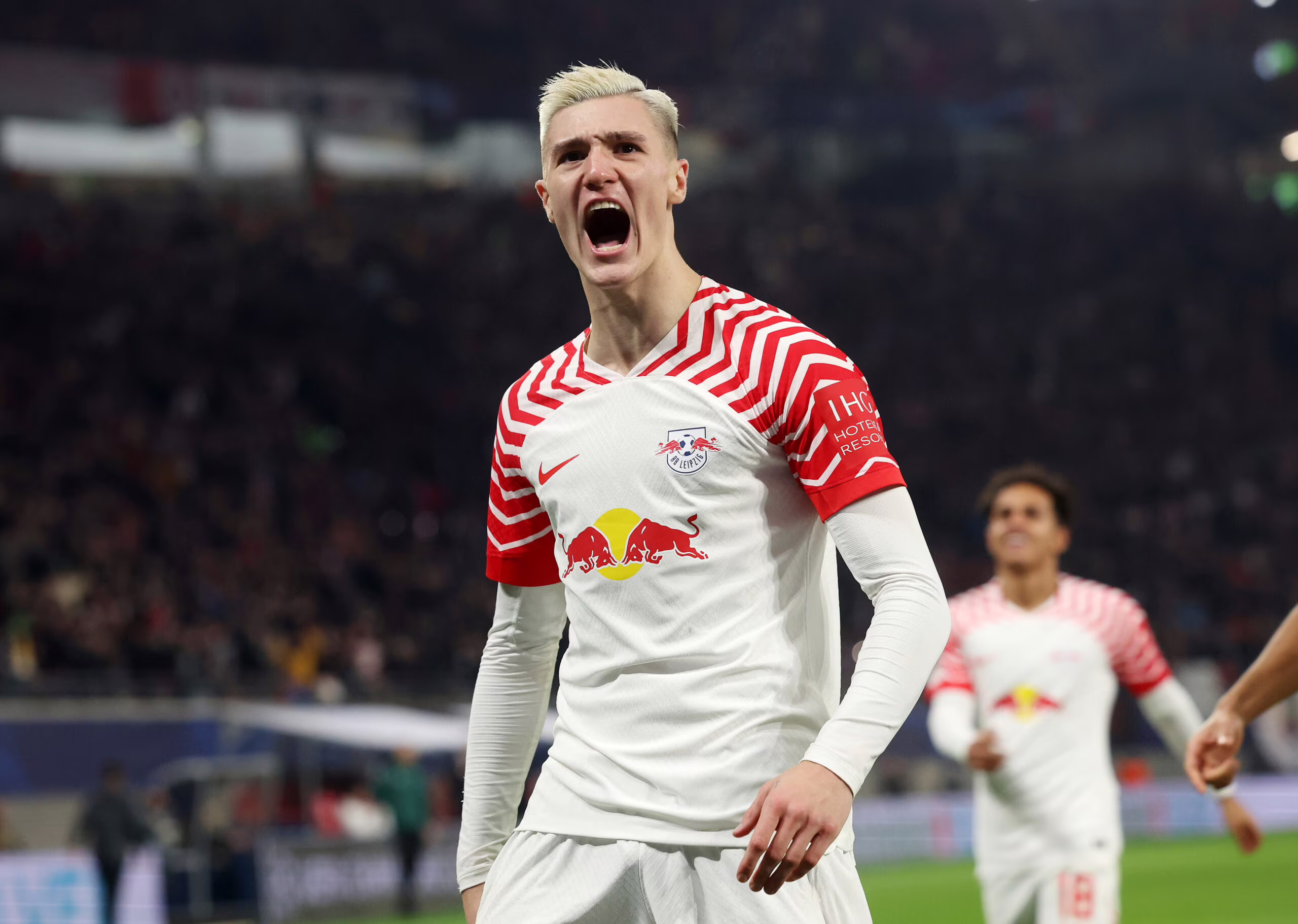 LEIPZIG, GERMANY - DECEMBER 13: Benjamin Sesko of RB Leipzig celebrates after scoring their team's first goal during the UEFA Champions League match between RB Leipzig and BSC Young Boys at Red Bull Arena on December 13, 2023 in Leipzig, Germany. (Photo by Alexander Hassenstein/Getty Images)