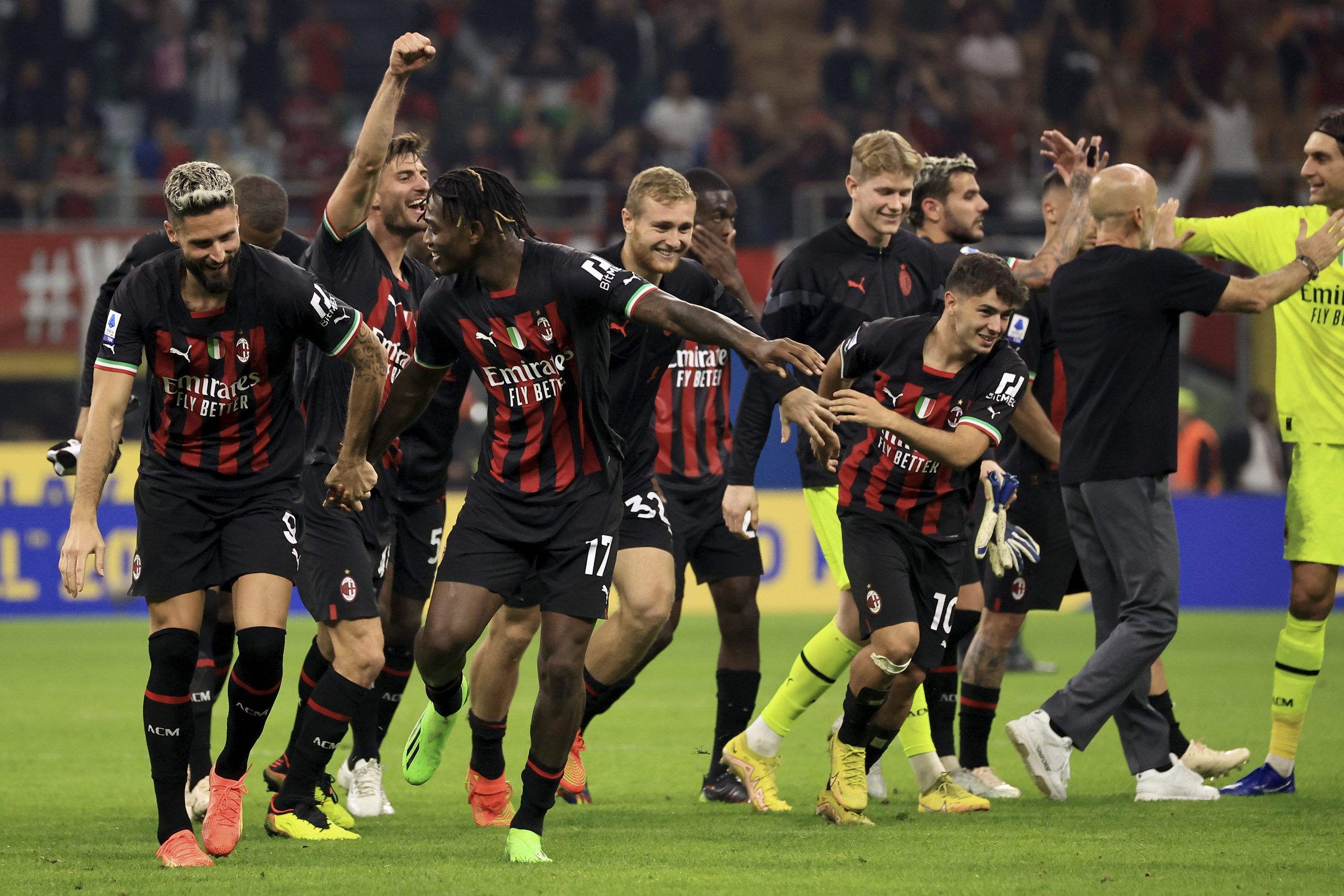 MILAN, ITALY - OCTOBER 08: Players of AC Milan celebrates the win at end of the Serie A match between AC Milan and Juventus at Stadio Giuseppe Meazza on October 08, 2022 in Milan, Italy. (Photo by Giuseppe Cottini/AC Milan via Getty Images)