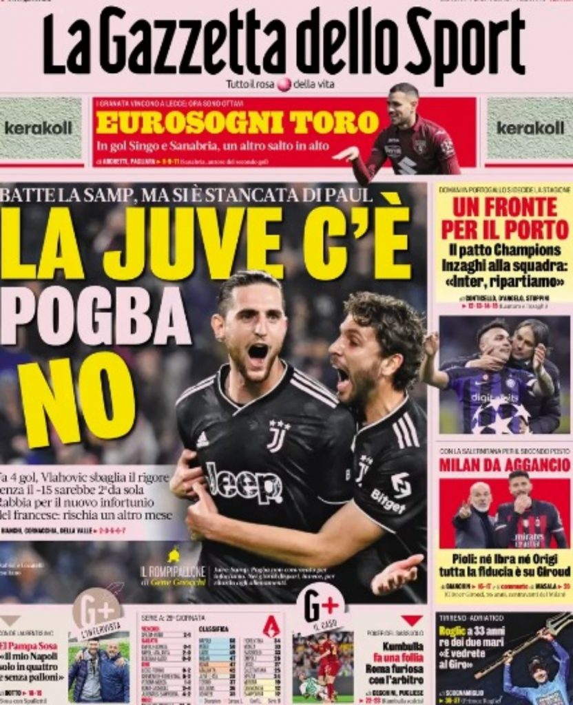 Il titolo della Rosea: Milan d’assalto. Il quotidiano spiega: Giroud fa gli straordinari, in attacco c’è soltanto lui per l’aggancio al secondo posto. Anche con alcuni problemi di formazione, la squadra di Pioli è determinata a non lasciarsi sfuggire l’occasione.