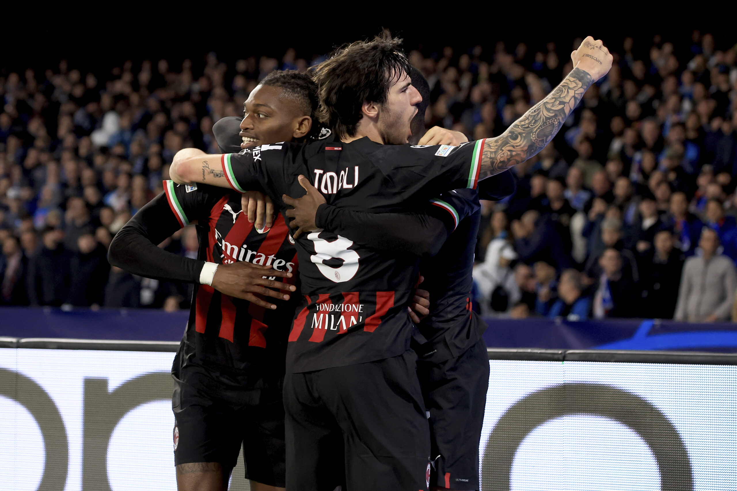 NAPLES, ITALY - APRIL 18: Rafael Leao of AC Milan and Sandro Tonali of AC Milan celebrates during the UEFA Champions League quarterfinal second leg match between SSC Napoli and AC Milan at Stadio Diego Armando Maradona on April 18, 2023 in Naples, Italy. (Photo by Giuseppe Cottini/AC Milan via Getty Images)