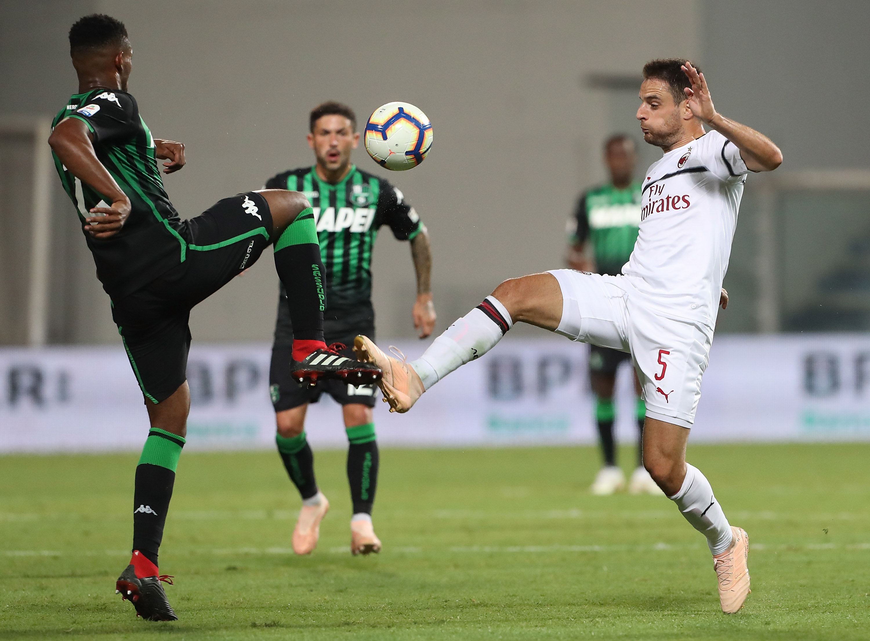 Giacomo Bonaventura, centrocampista del Milan, contrasta un calciatore del Sassuolo.