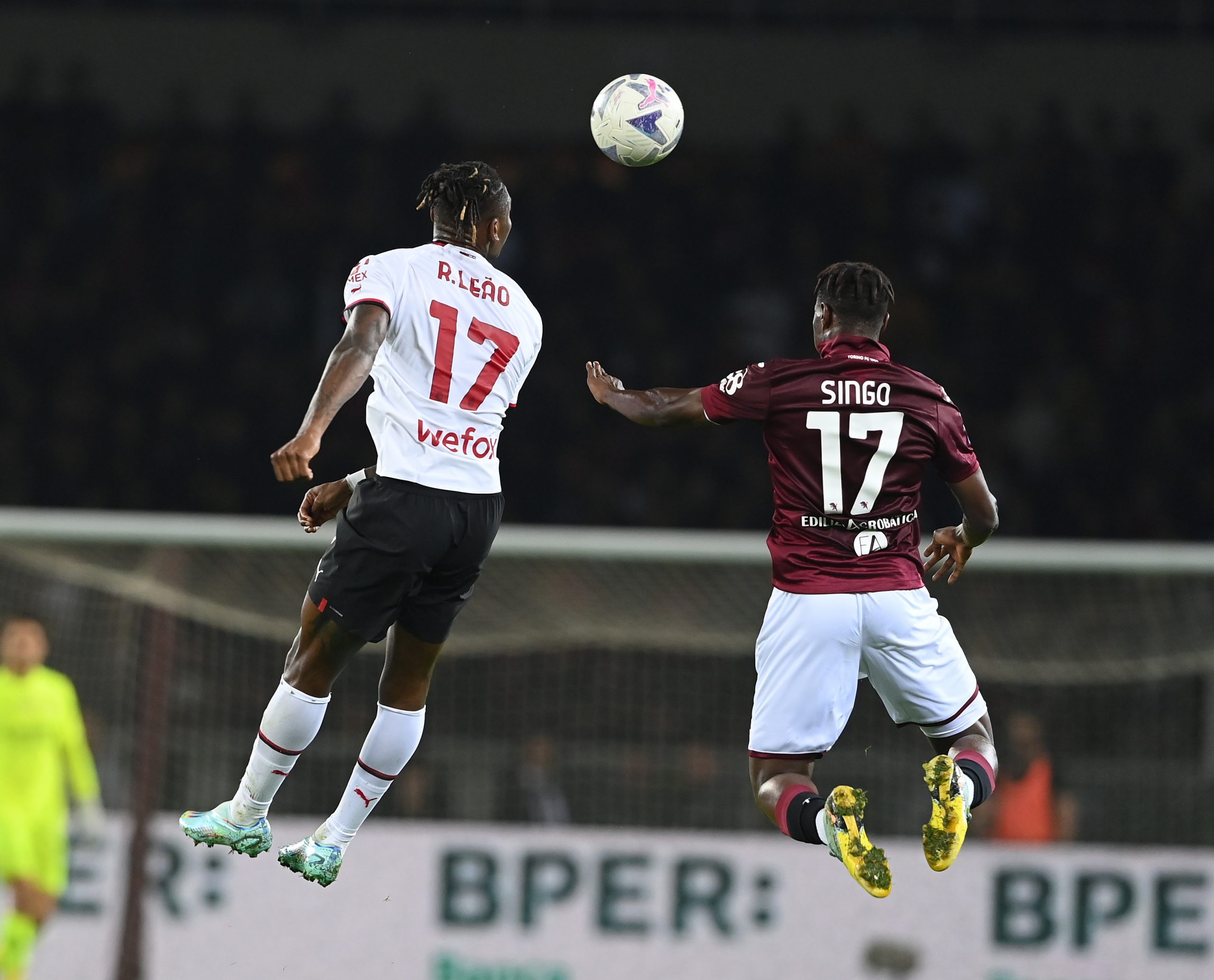 TURIN, ITALY - OCTOBER 30: Rafael Leao of AC Milan competes for the ball with Wilfried Singo of Torino FC during the Serie A match between Torino FC and AC Milan at Stadio Olimpico di Torino on October 30, 2022 in Turin, Italy. (Photo by Claudio Villa/AC Milan via Getty Images)