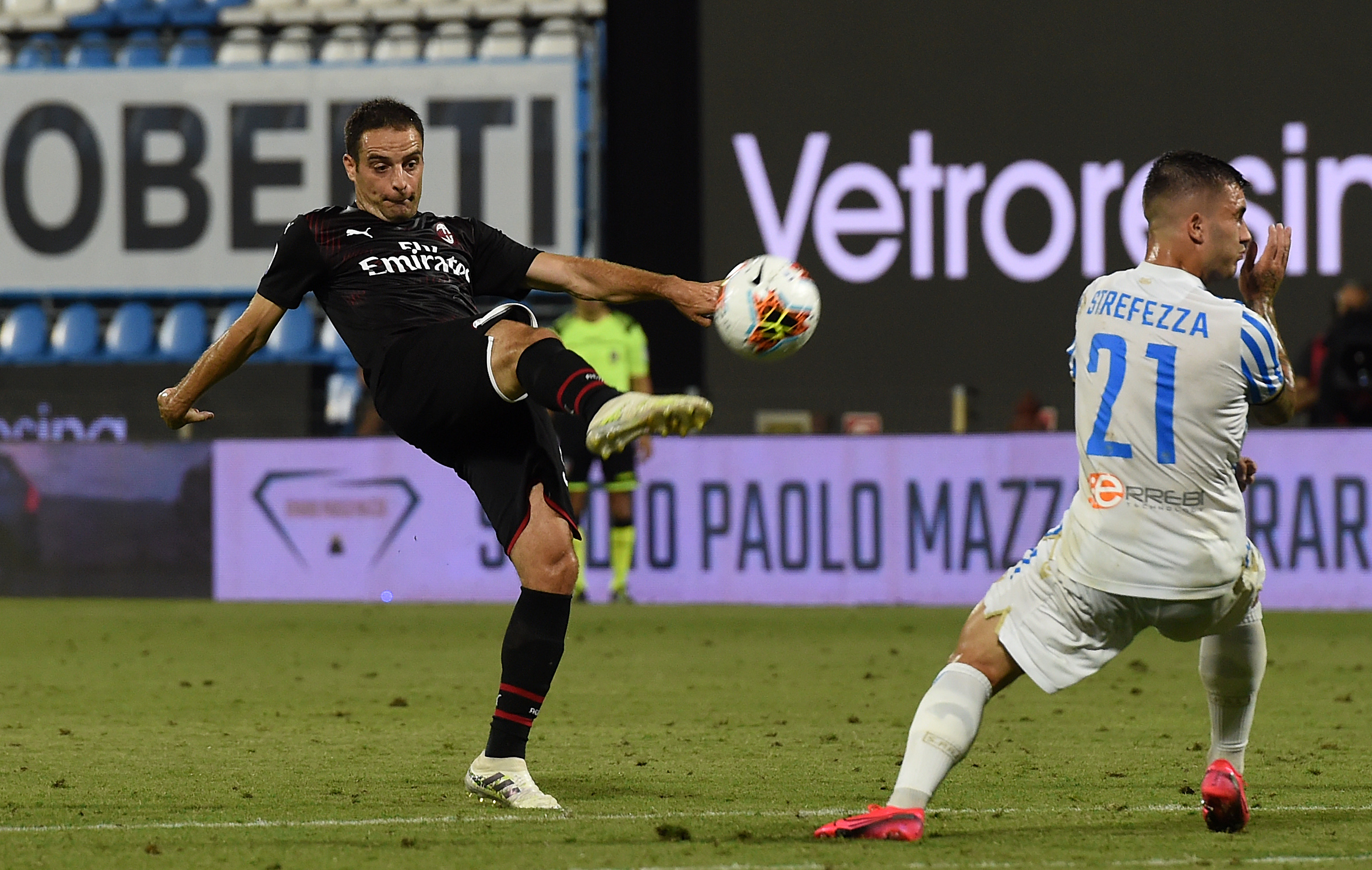 FERRARA, ITALY - JULY 01: Giacomo Bonaventura of AC Milan shoots past Gabriel Strefezza of SPAL during the Serie A match between SPAL and AC Milan at Stadio Paolo Mazza on July 1, 2020 in Ferrara, Italy. (Photo by Chris Ricco/Getty Images)