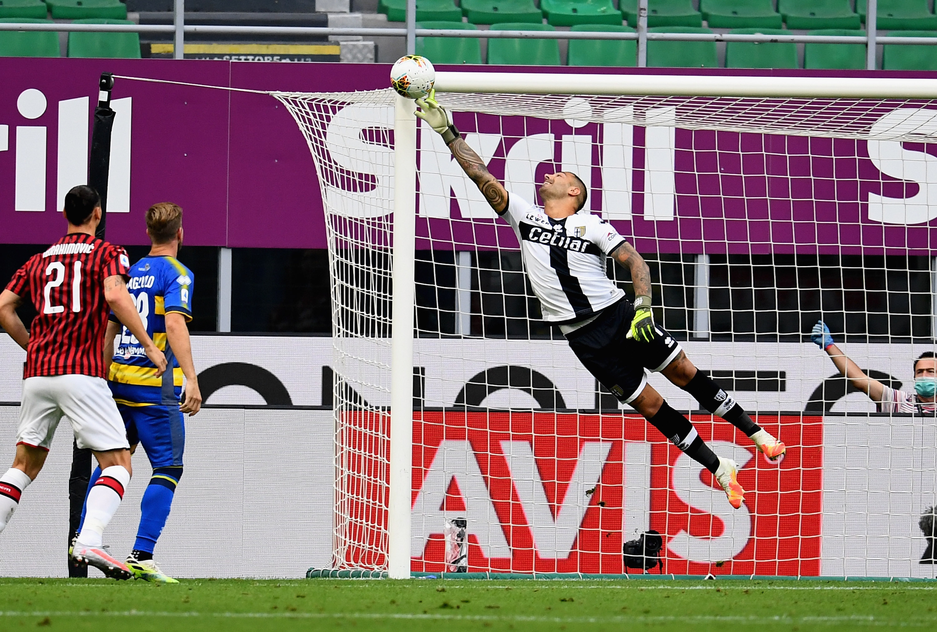 MILAN, ITALY - JULY 15: Luigi Sepe of Parma saves the ball during the Serie A match between AC Milan and Parma Calcio at Stadio Giuseppe Meazza on July 15, 2020 in Milan, Italy. (Photo by Claudio Villa/Getty Images)