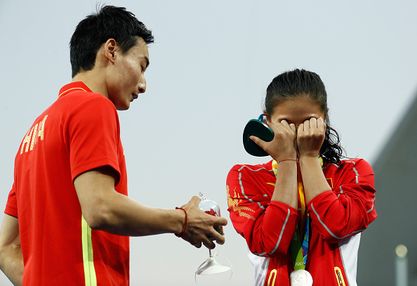 RIO DE JANEIRO, BRAZIL - AUGUST 14: Chinese diver Qin Kai proposes to silver medalist He Zi of China on the podium during the medal ceremony for the Women's Diving 3m Springboard Final on Day 9 of the Rio 2016 Olympic Games at Maria Lenk Aquatics Centre on August 14, 2016 in Rio de Janeiro, Brazil. (Photo by Clive Rose/Getty Images)